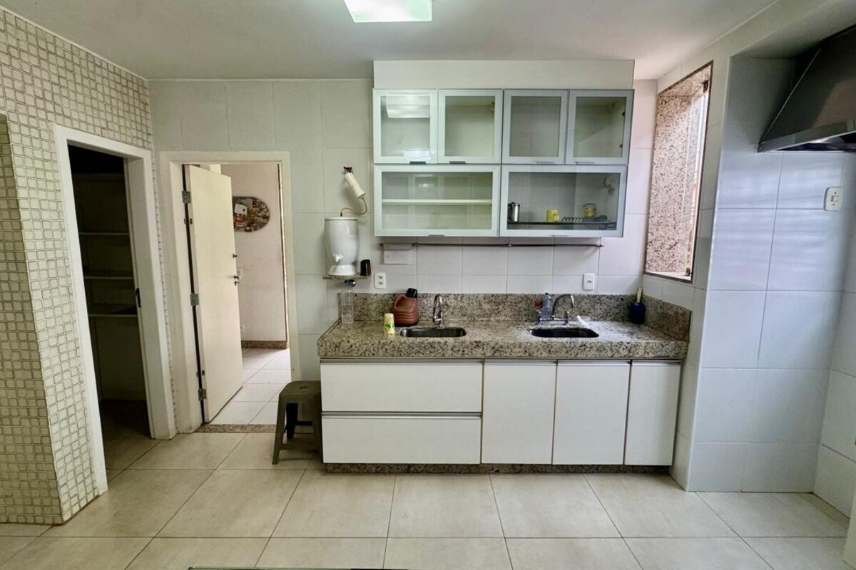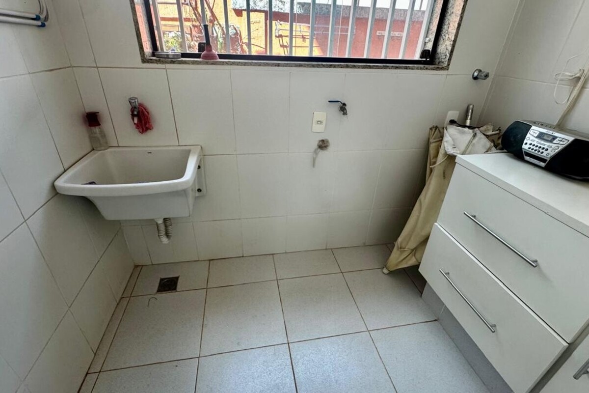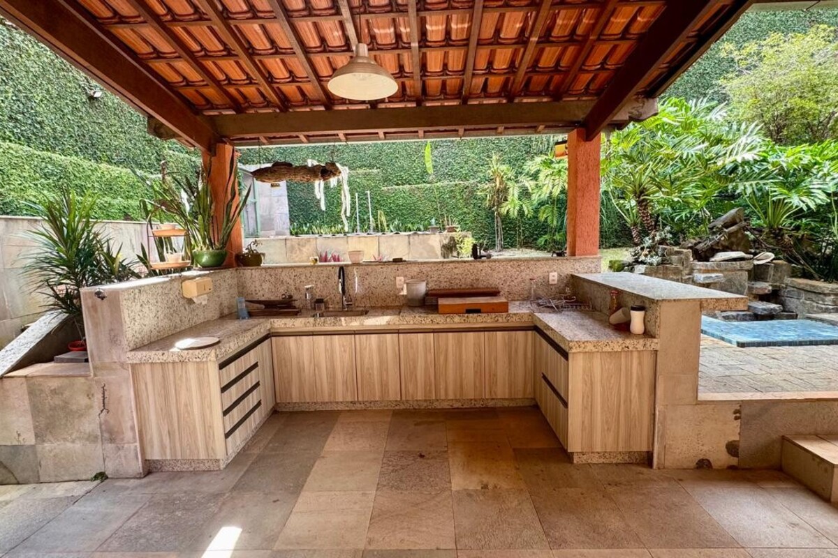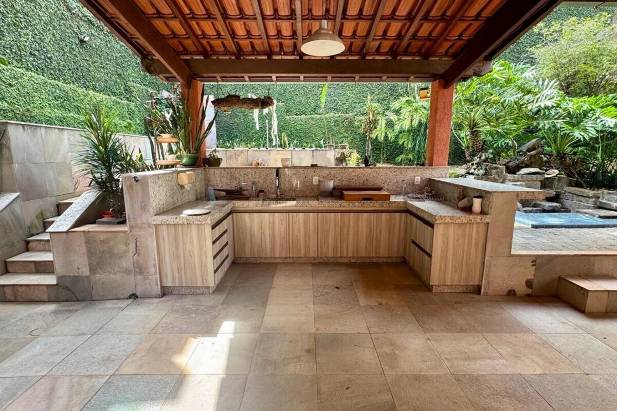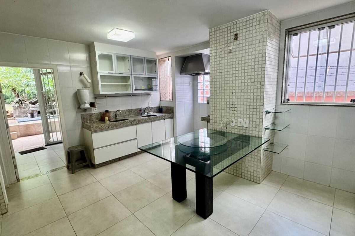 A cozinha é ampla, planejada e bem equipada, com ótimo aproveitamento de espaço, integrada à copa. A casa possui ainda área de serviço independente, despensa e dependência completa de empregada.