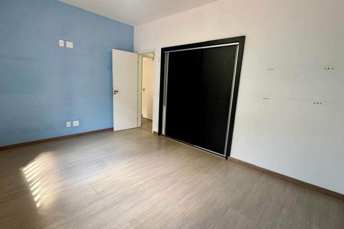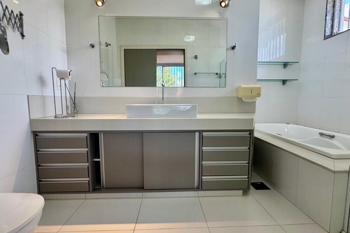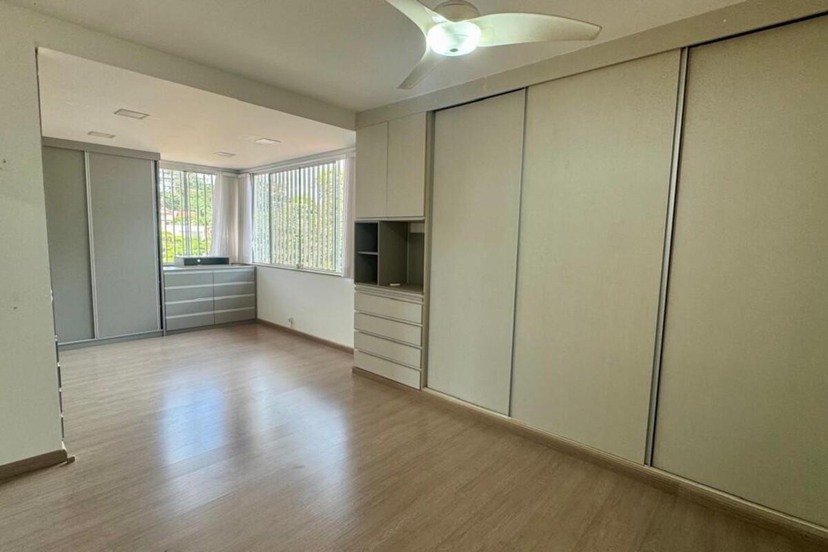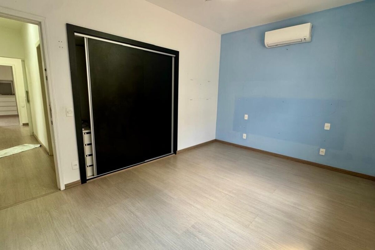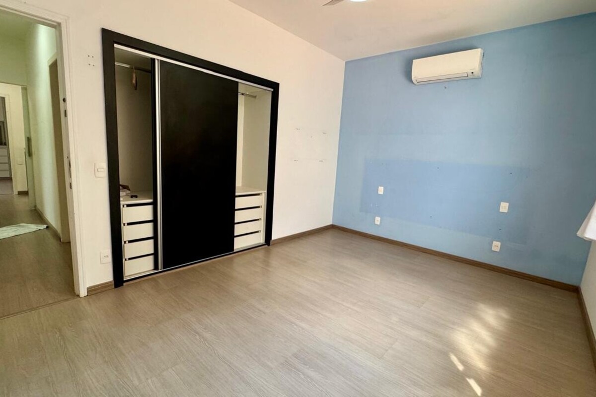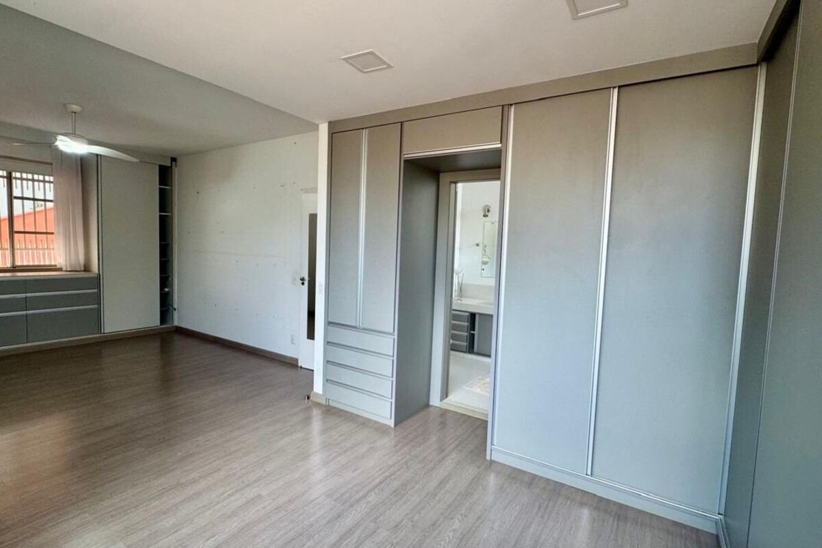 A área íntima dispõe de quatro quartos espaçosos, todos com armários planejados e ar-condicionado. A suíte master se destaca pelo conforto, com banheira de hidromassagem e excelente espaço de armários. O corredor conta ainda com rouparia, garantindo praticidade à rotina.