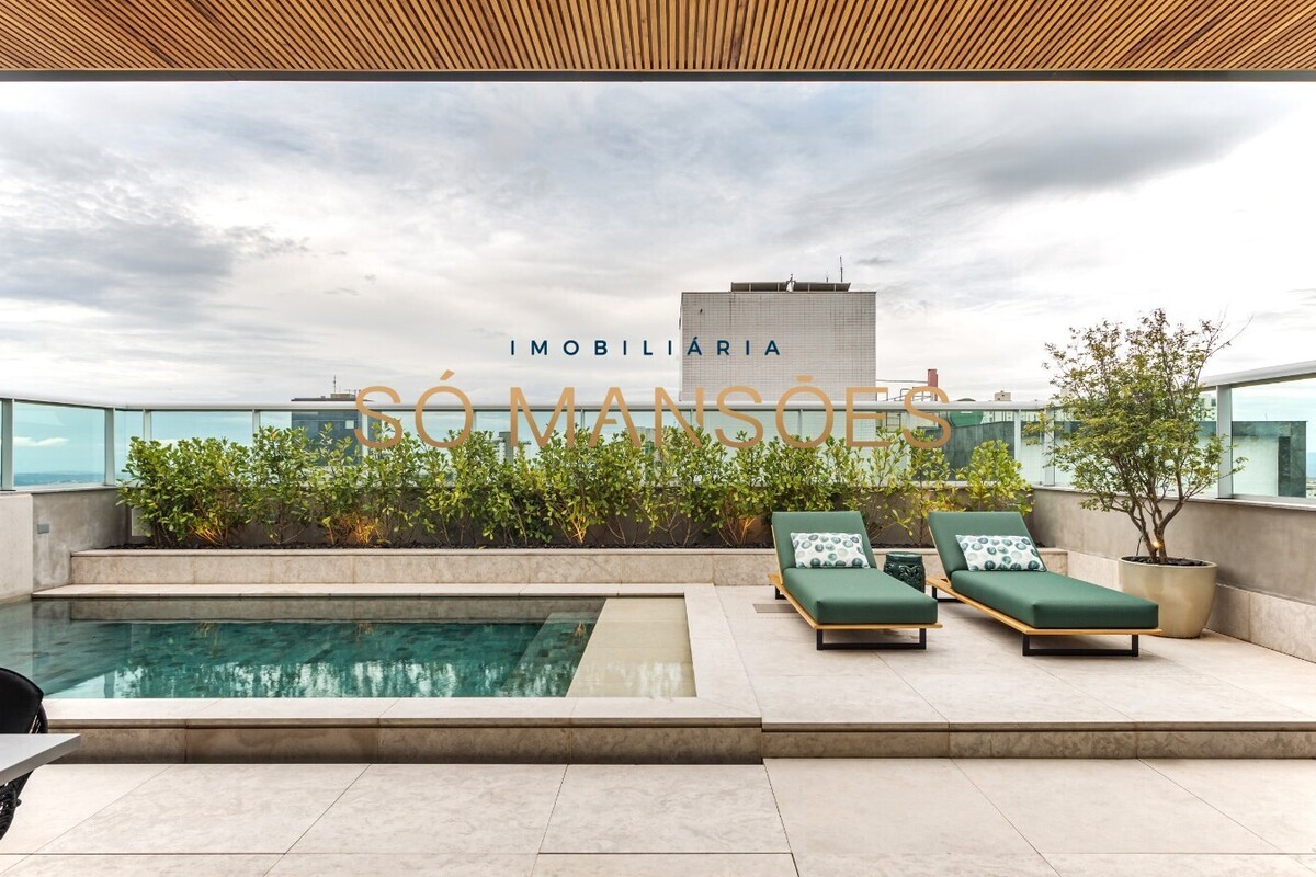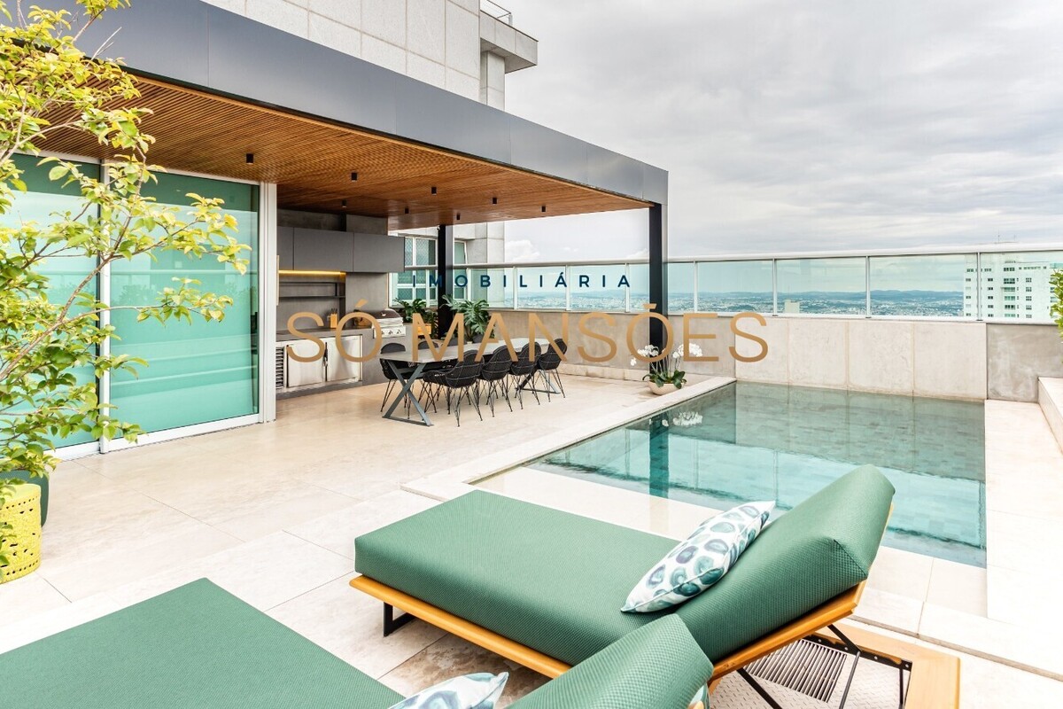 Cobertura Top House com 377m² à venda no Vila da Serra, com vista aberta para a cidade e para as montanhas de Nova Lima. O imóvel passou por um projeto de reconfiguração e, originalmente com quatro quartos, foi transformado em três suítes, incluindo uma suíte master ampla, com closet estendido e banheiro senhor e senhora. O projeto arquitetônico é assinado por arquiteta renomada, com atenção aos detalhes e à funcionalidade dos ambientes.