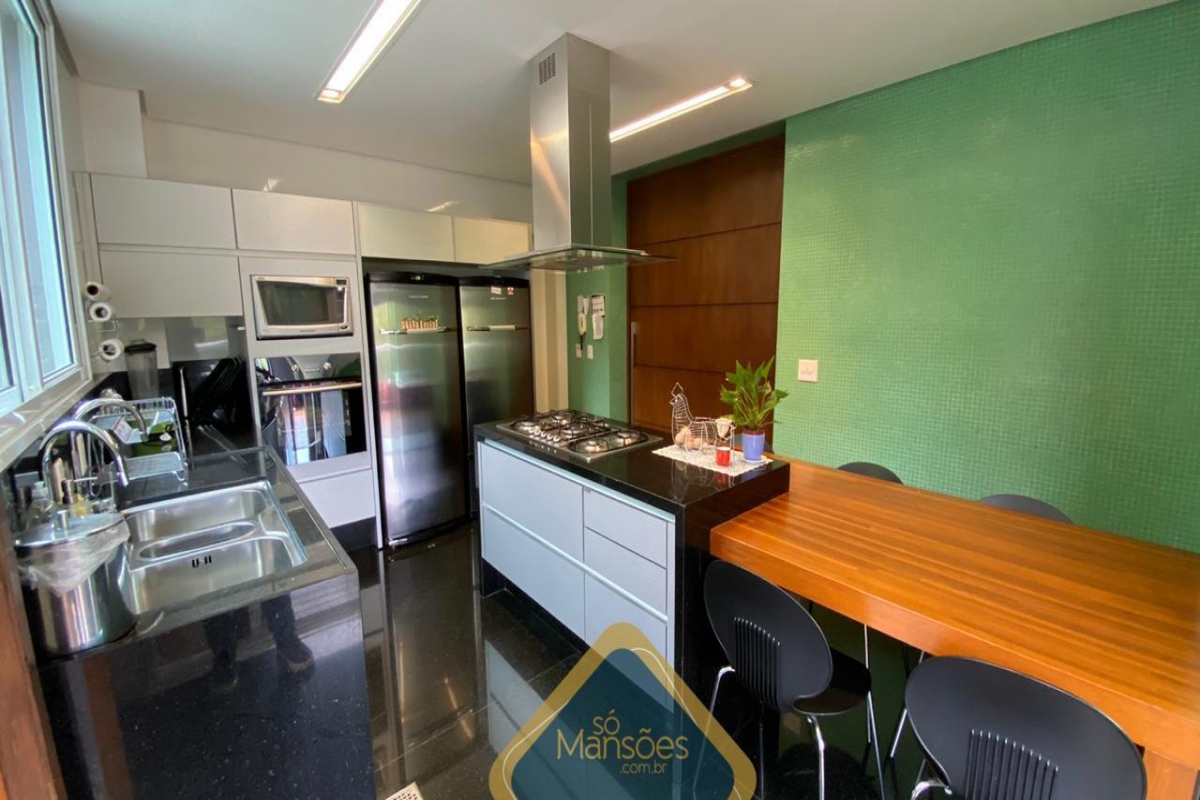 Pavimento inferior: Sala ampla dividida em três ambientes, 2 varandas, lavabo, cristaleira, despensa, cozinha com ilha e armários planejados, DCE.