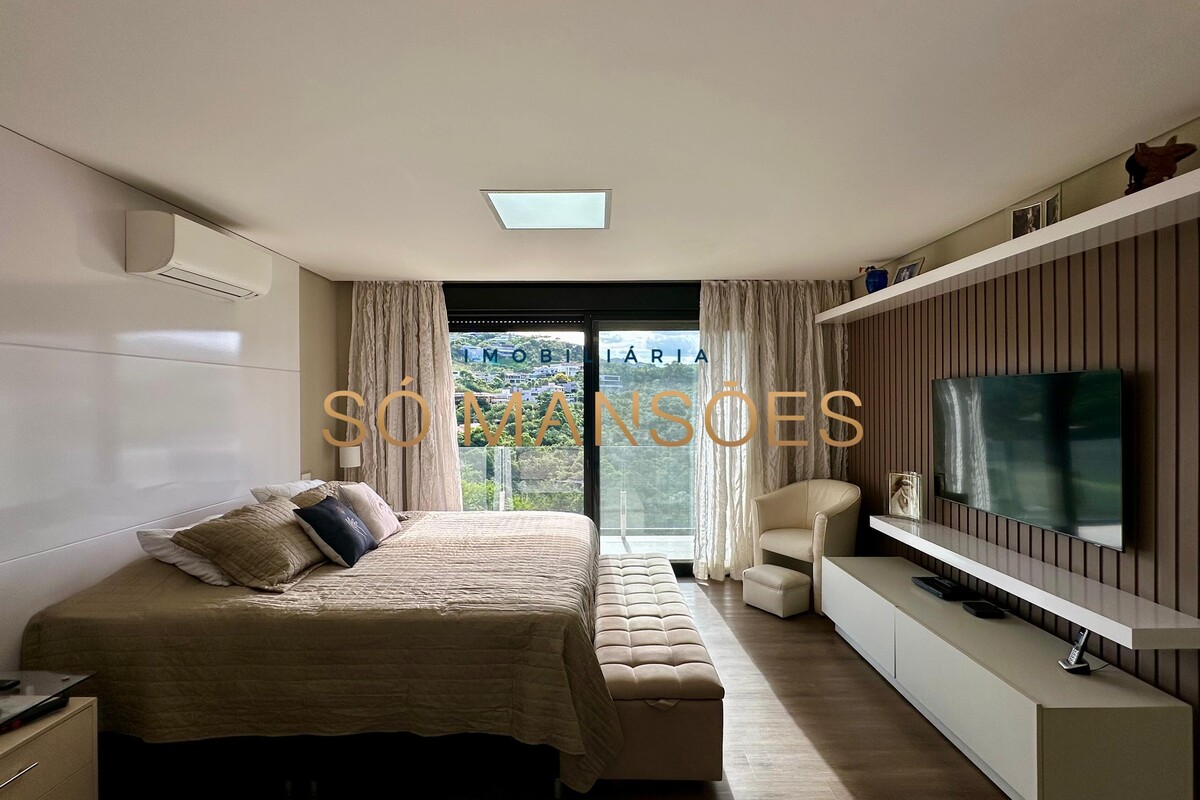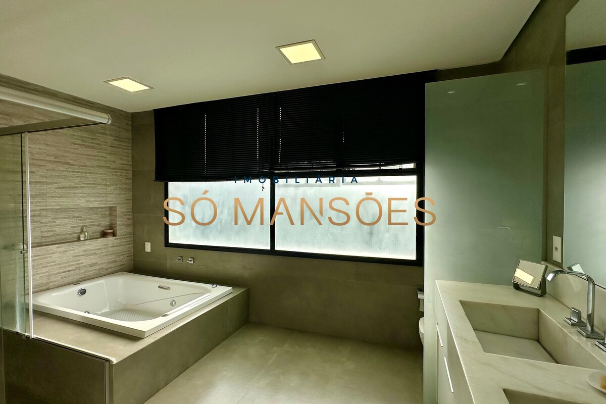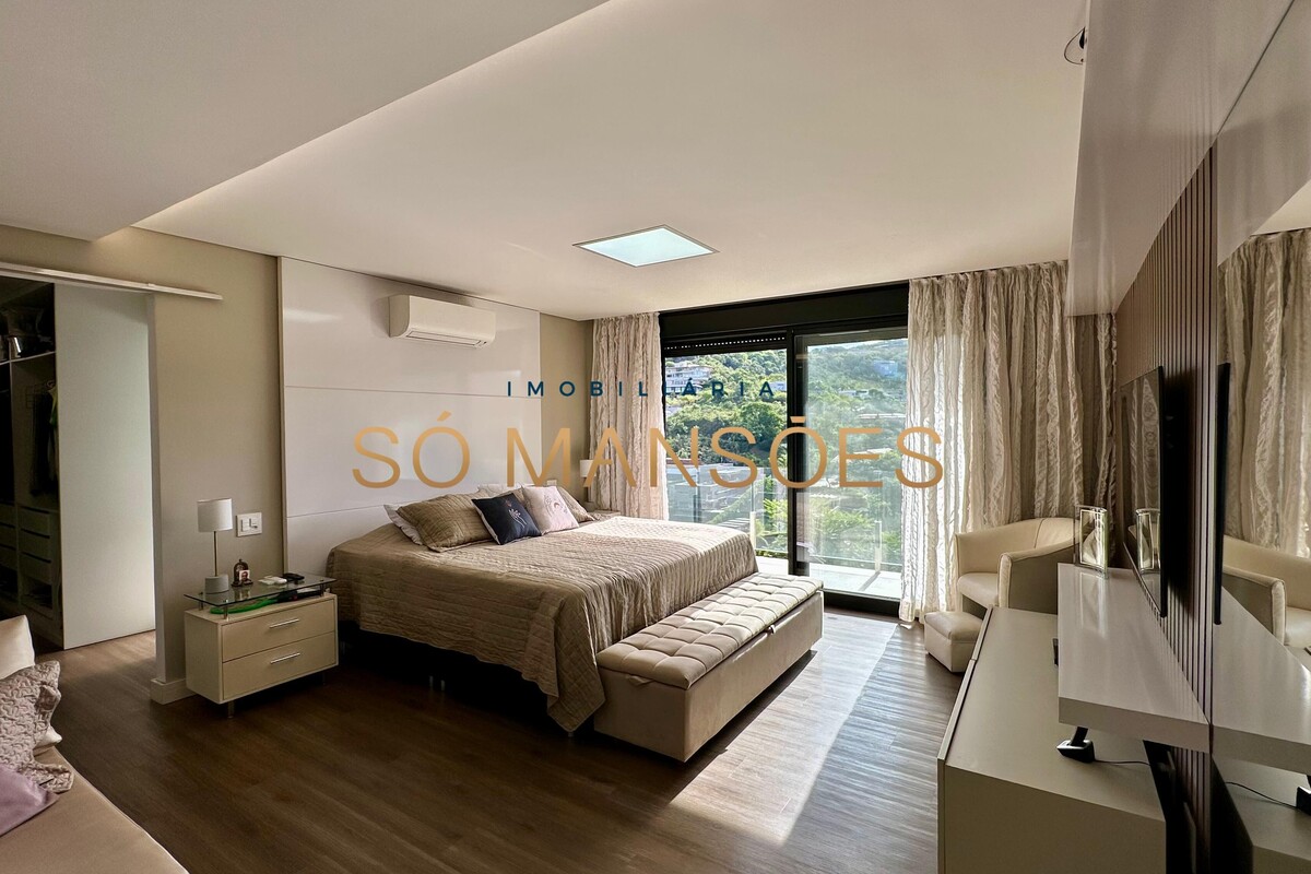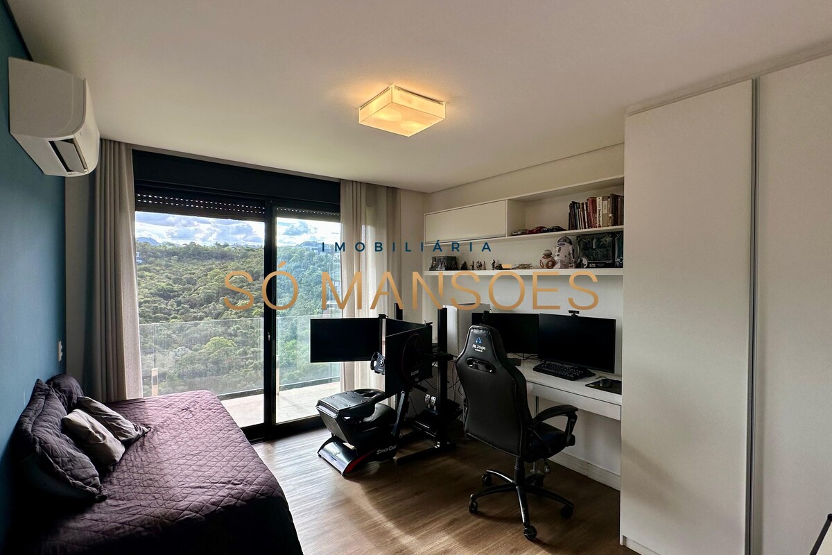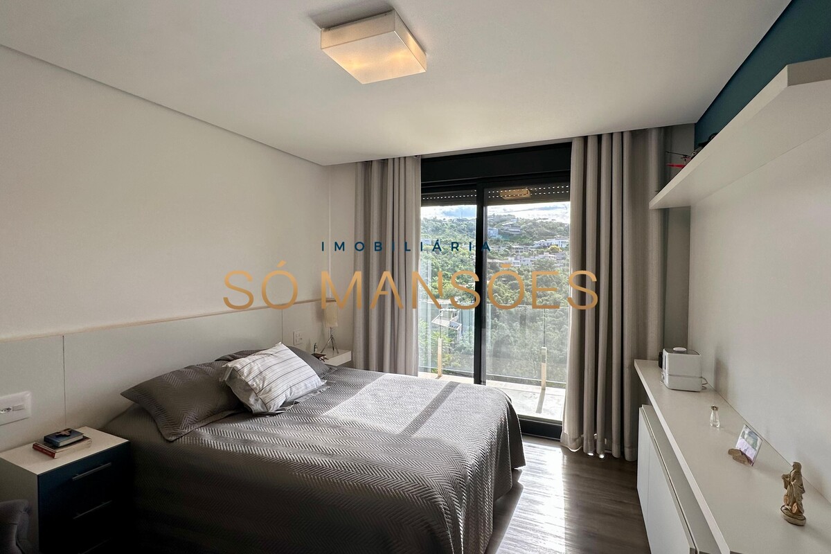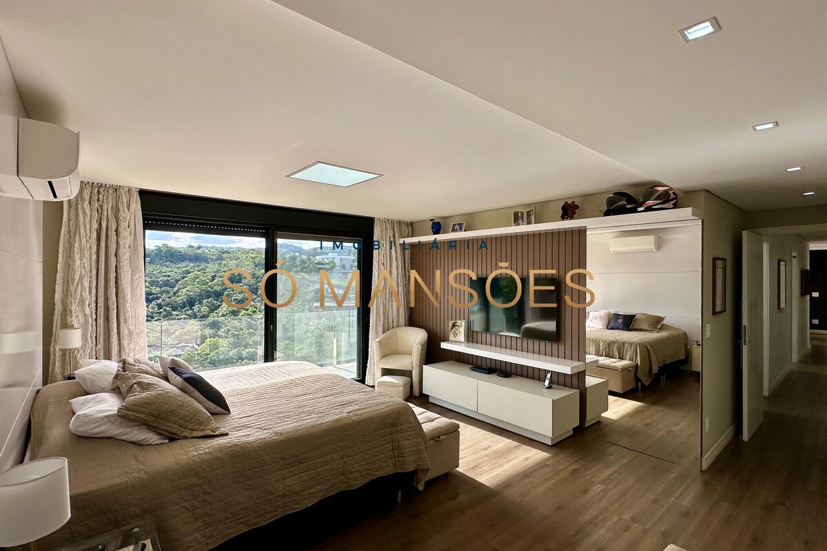No pavimento íntimo, a casa conta com uma sala de TV, duas suítes, sendo a suíte master com 2 amplos closets e banheiro com hidromassagem, além de duas semi-suítes. Três dos quartos e a sala de TV possuem varanda, permitindo aproveitar a vista e o pôr do sol. O imóvel dispõe ainda de dependência completa para funcionária, complementando a estrutura residencial.