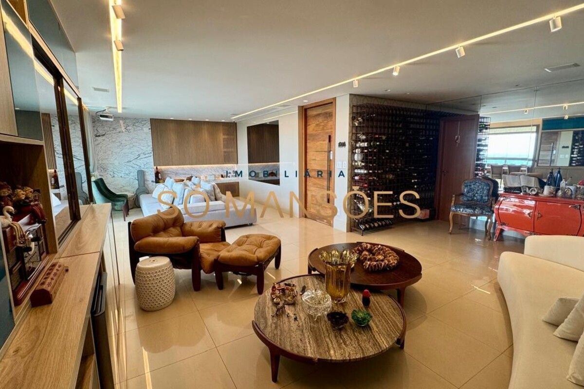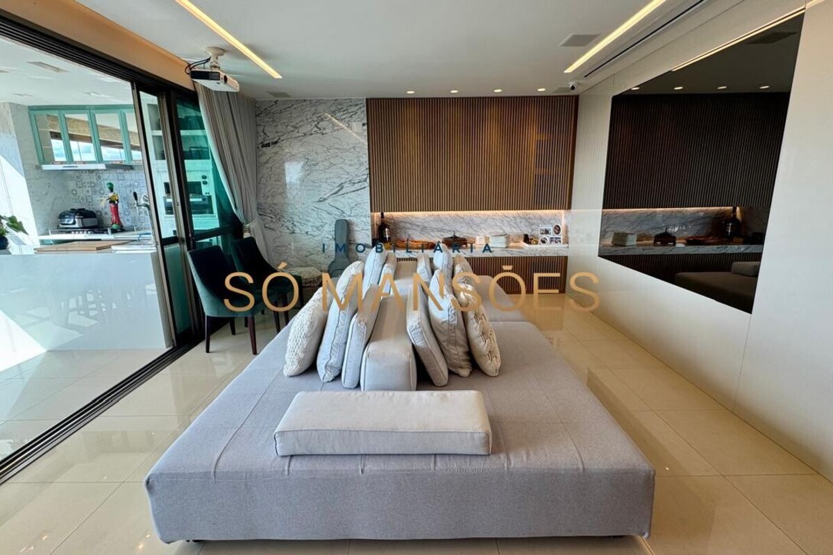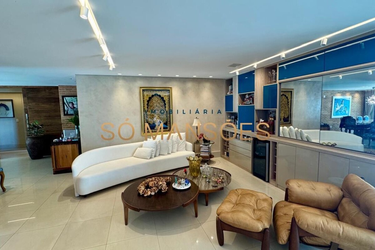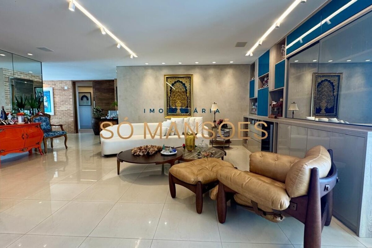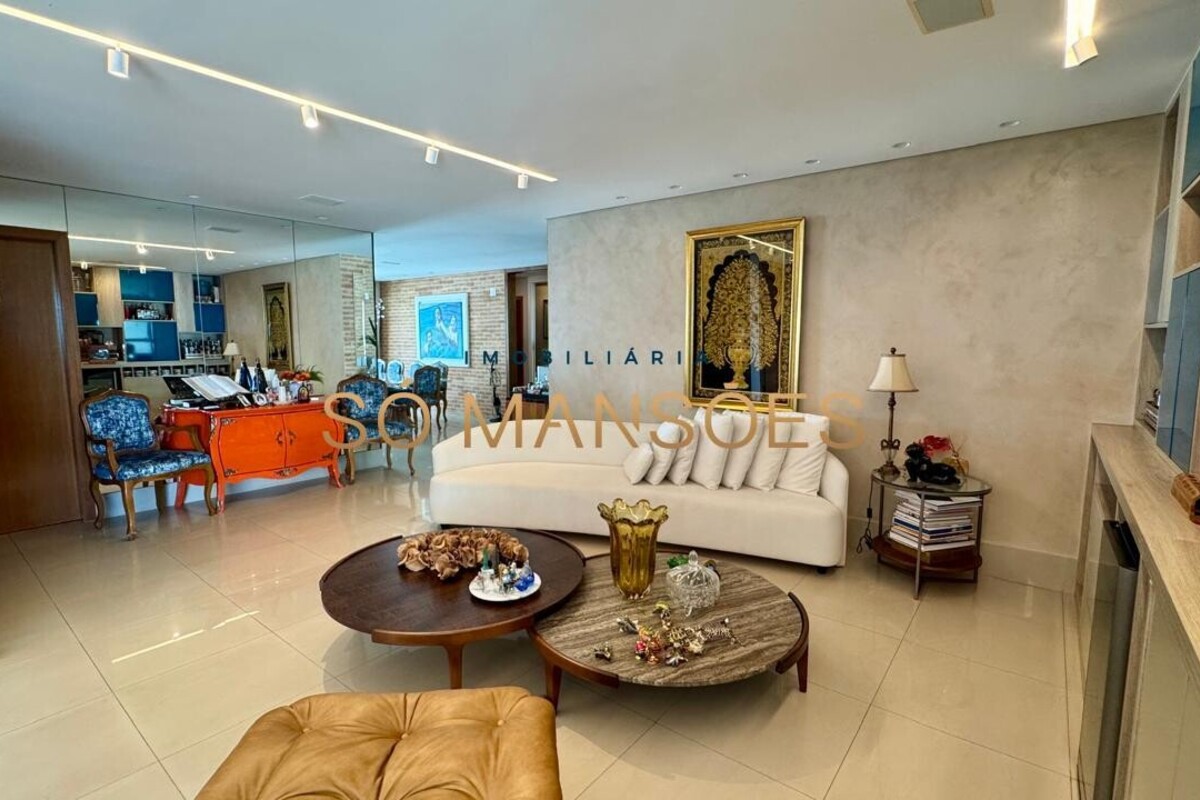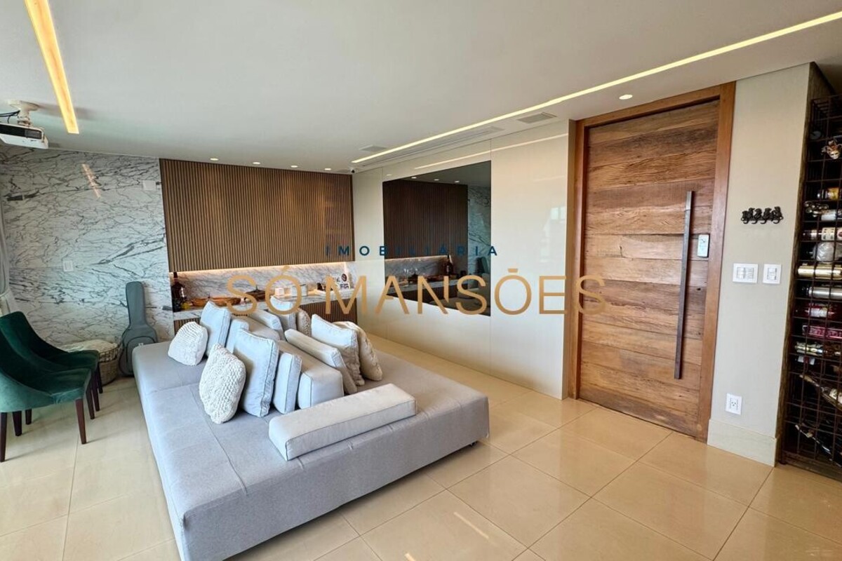 Os acabamentos reforçam o alto padrão do imóvel, com pisos em porcelanato, mármore e granito, madeira maciça, marcenaria planejada e ar-condicionado nas suítes. O apartamento conta ainda com 4 vagas de garagem livres e paralelas.