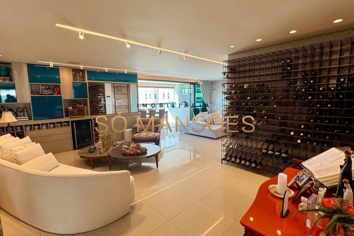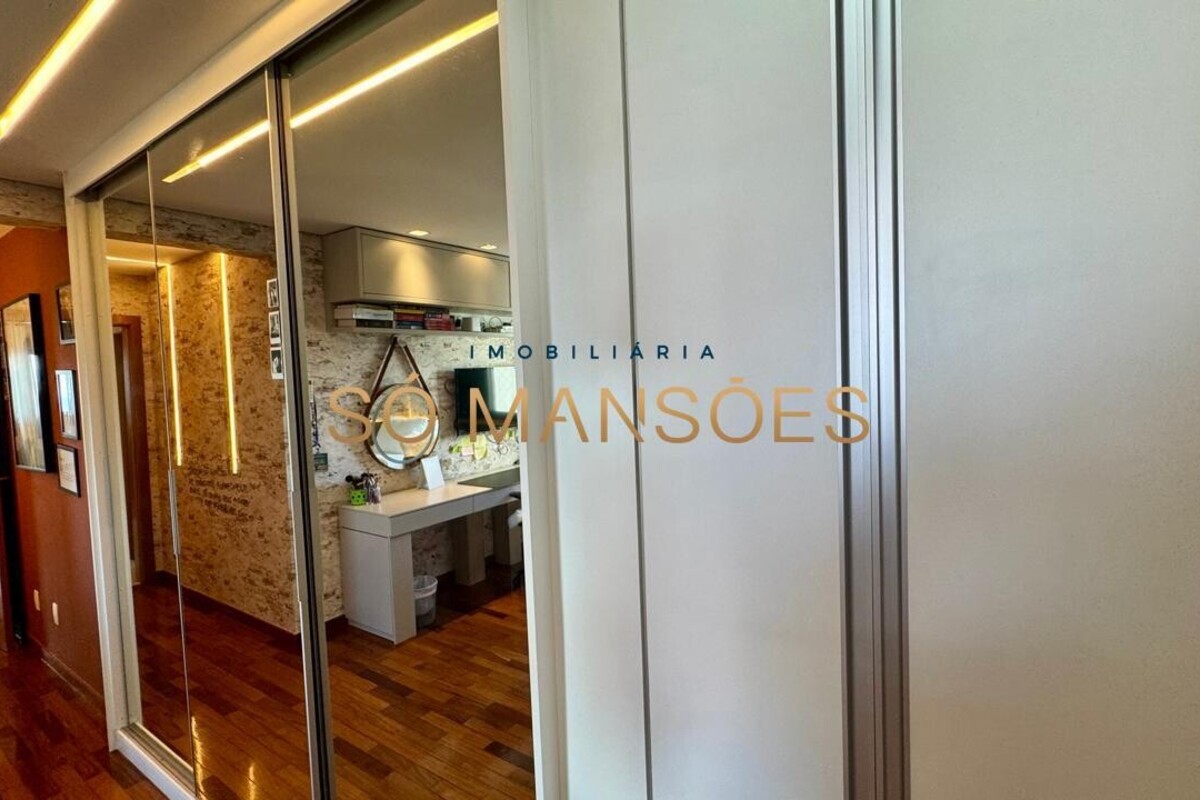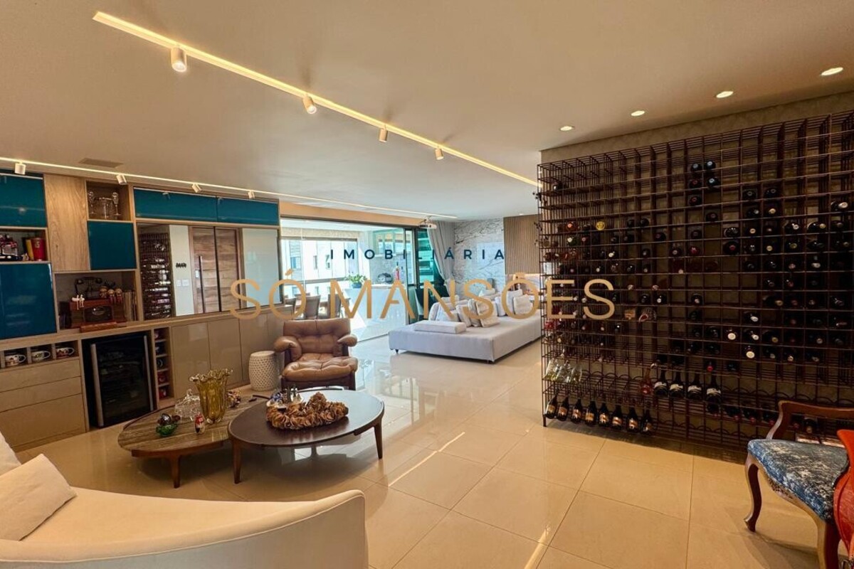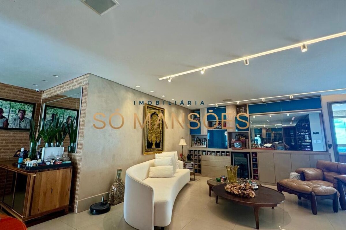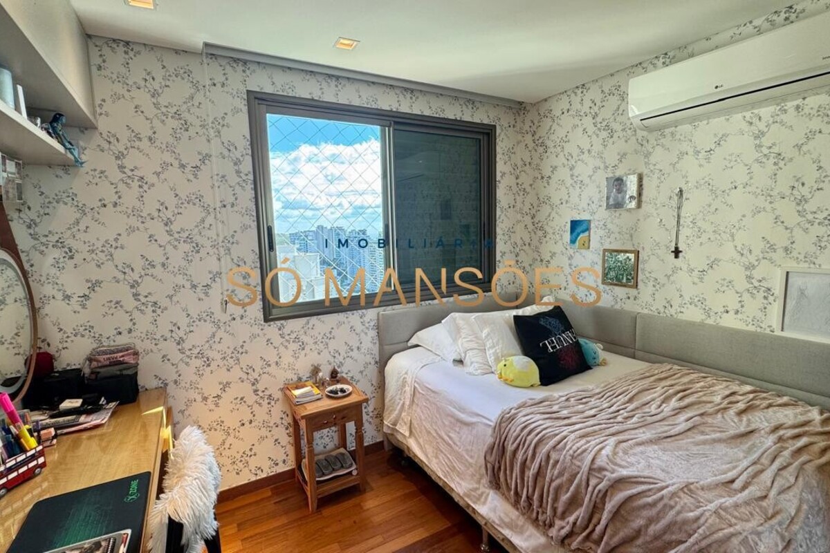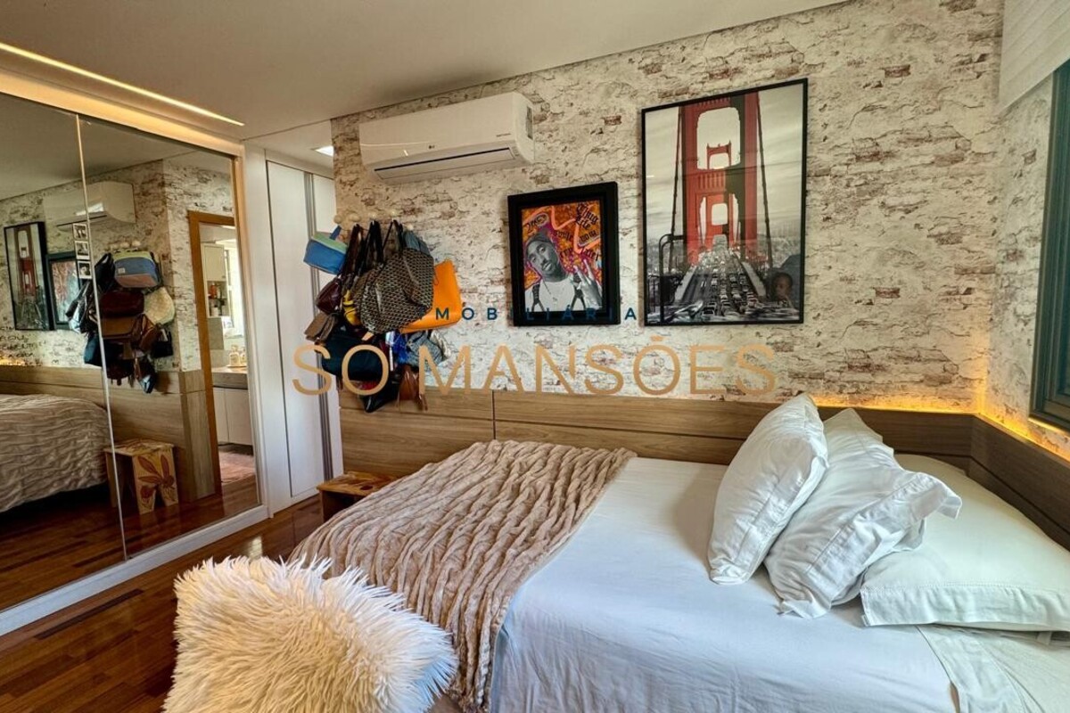Os acabamentos reforçam o alto padrão do imóvel, com pisos em porcelanato, mármore e granito, madeira maciça, marcenaria planejada e ar-condicionado nas suítes. O apartamento conta ainda com 4 vagas de garagem livres e paralelas.