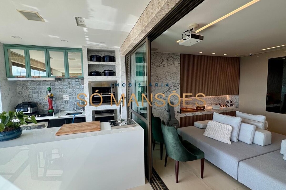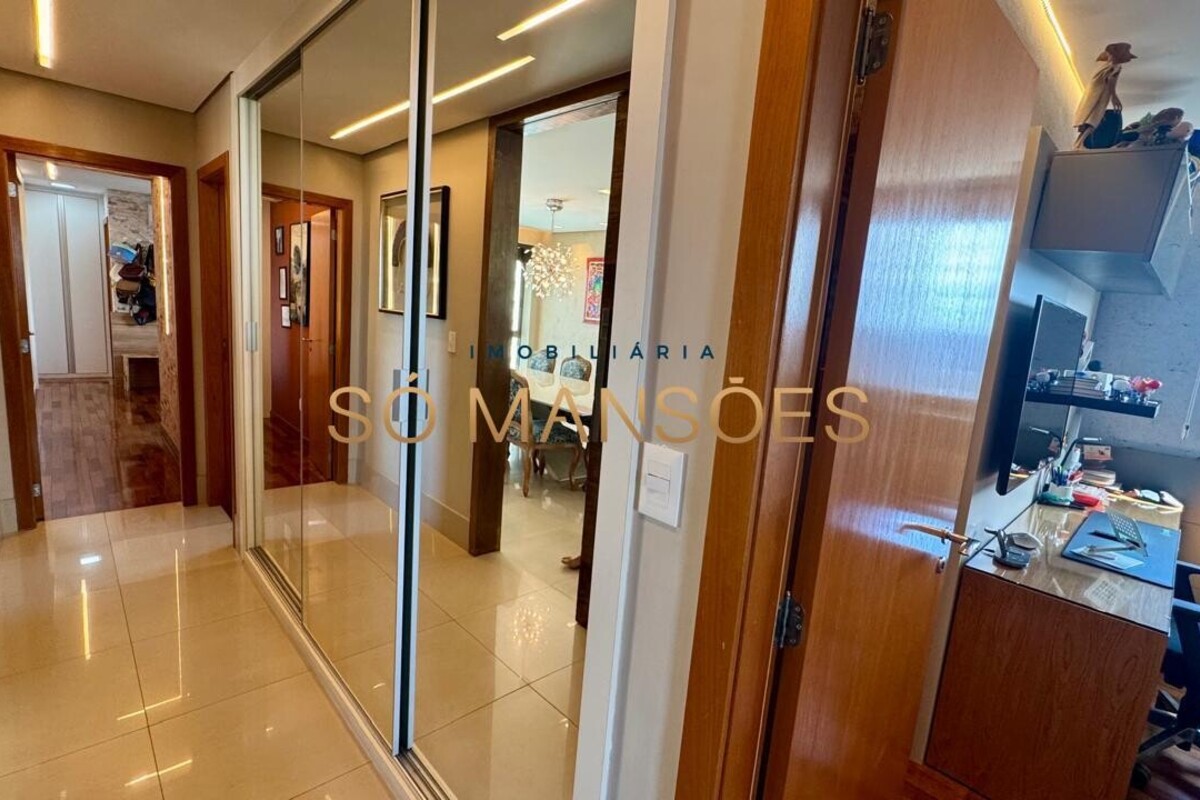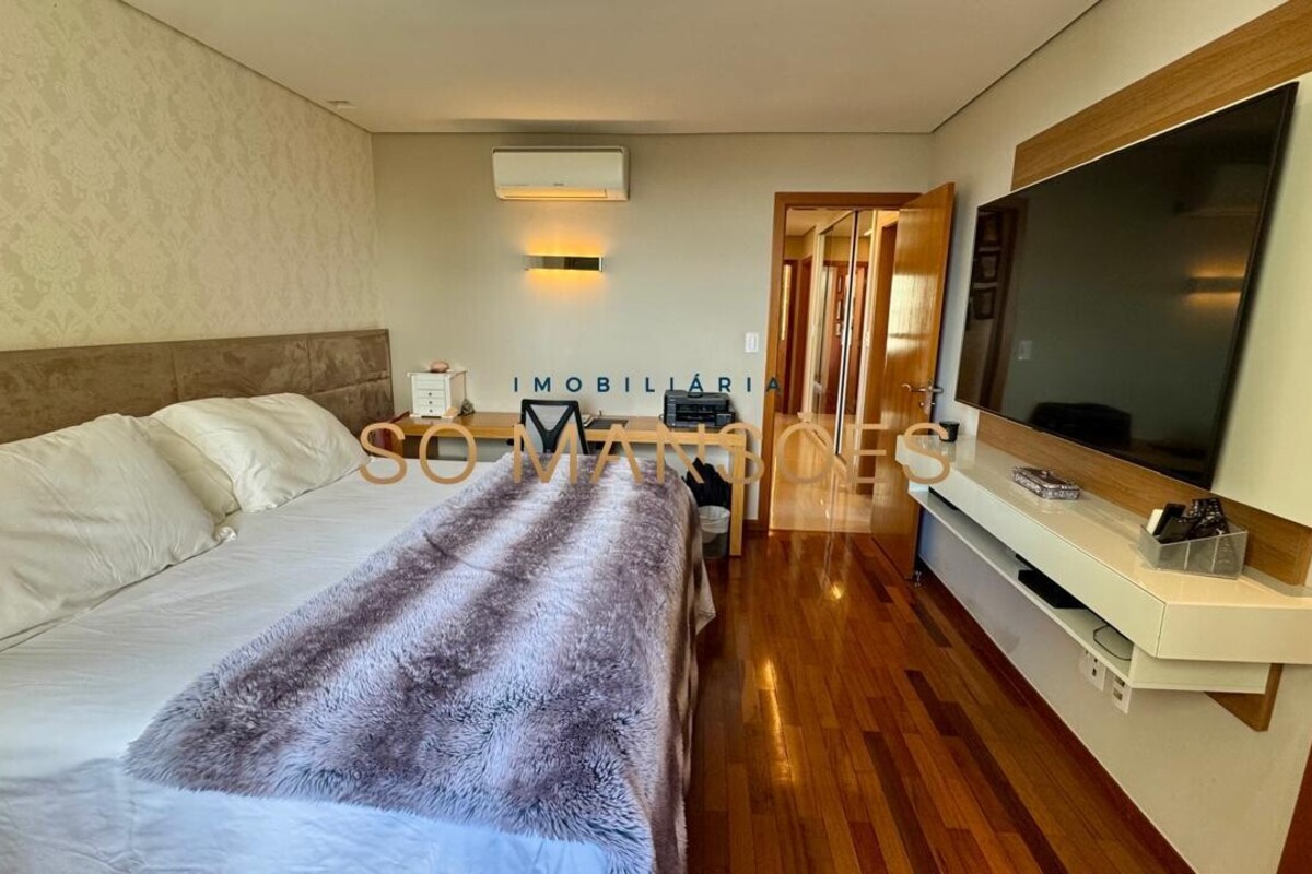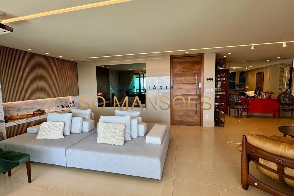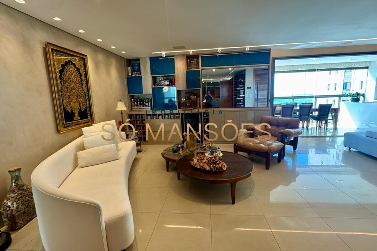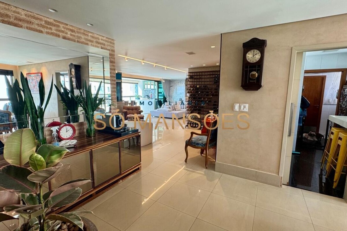 Os acabamentos reforçam o alto padrão do imóvel, com pisos em porcelanato, mármore e granito, madeira maciça, marcenaria planejada e ar-condicionado nas suítes. O apartamento conta ainda com 4 vagas de garagem livres e paralelas.