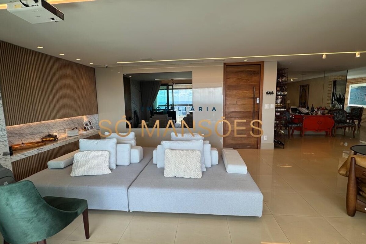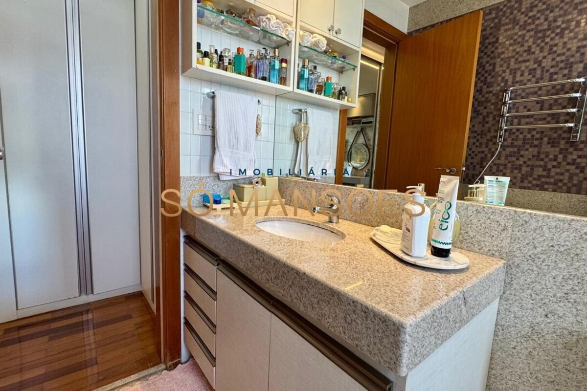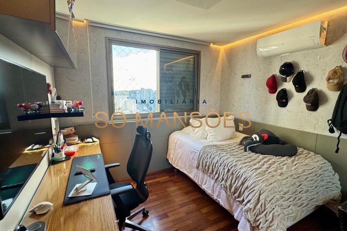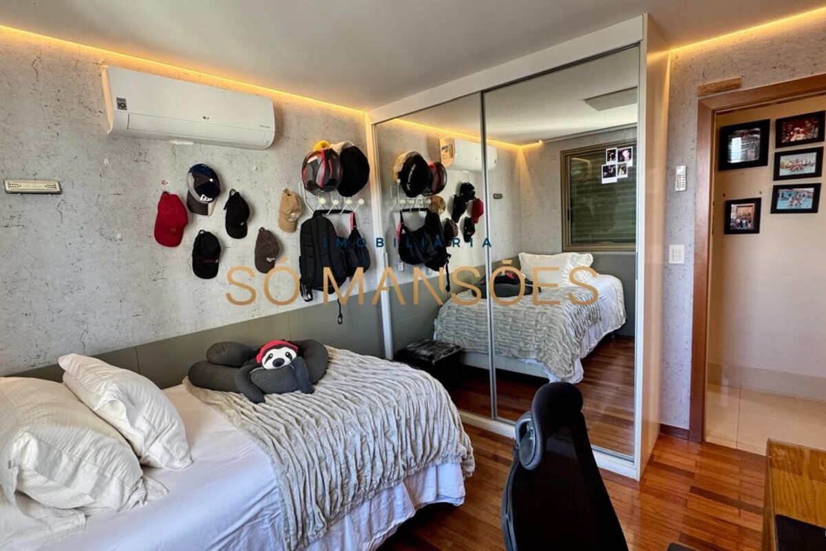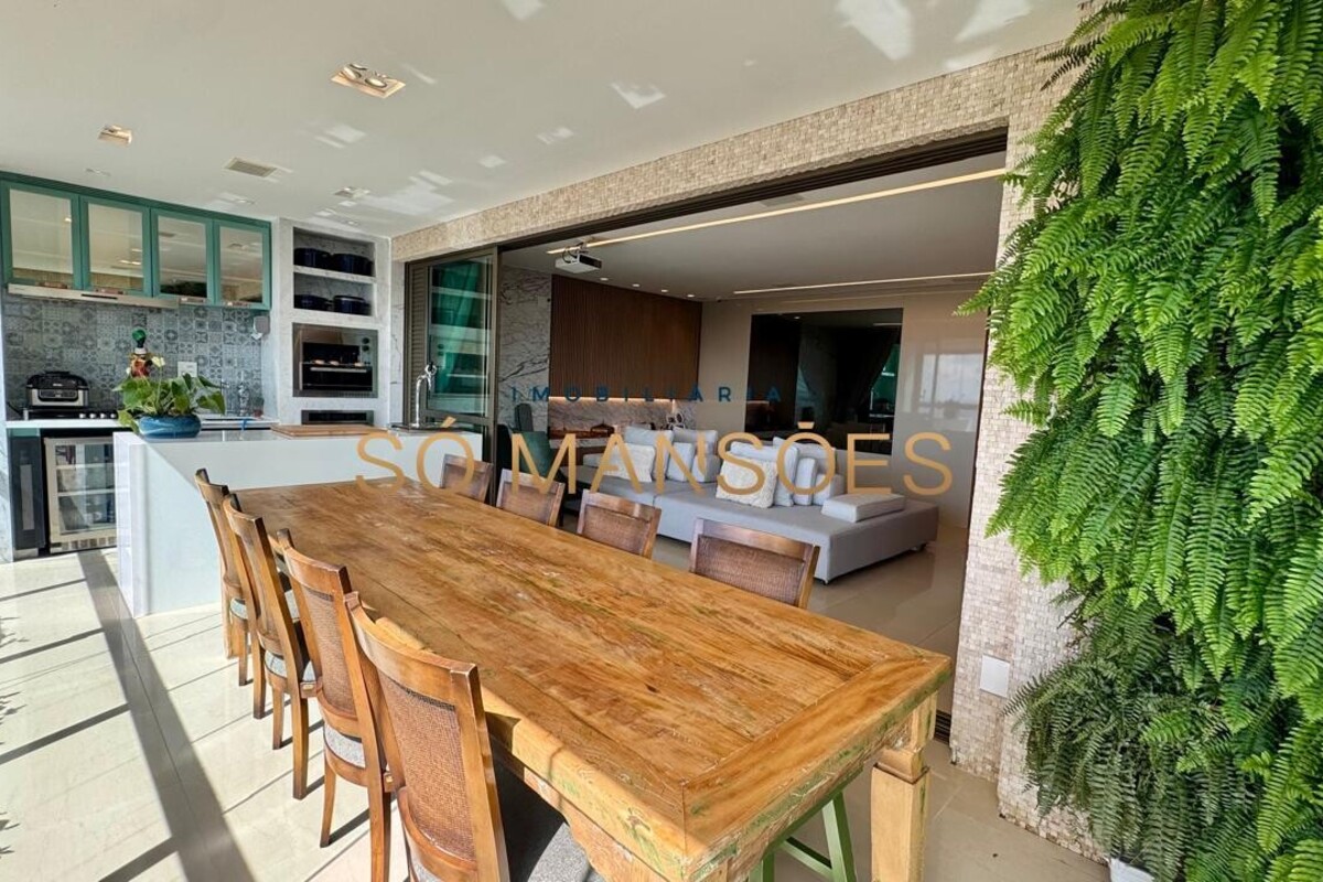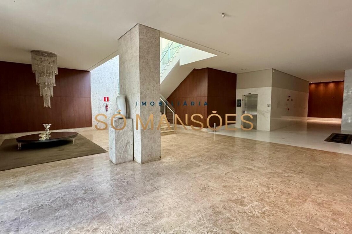 Os acabamentos reforçam o alto padrão do imóvel, com pisos em porcelanato, mármore e granito, madeira maciça, marcenaria planejada e ar-condicionado nas suítes. O apartamento conta ainda com 4 vagas de garagem livres e paralelas.