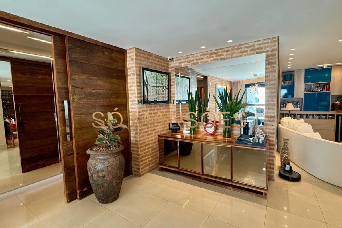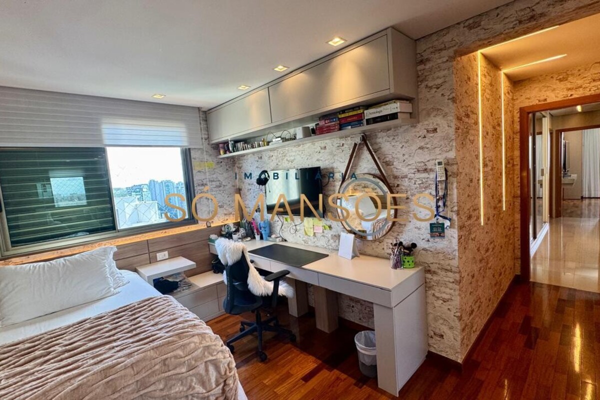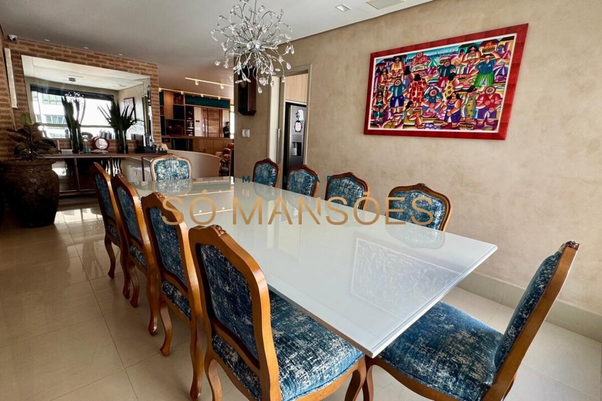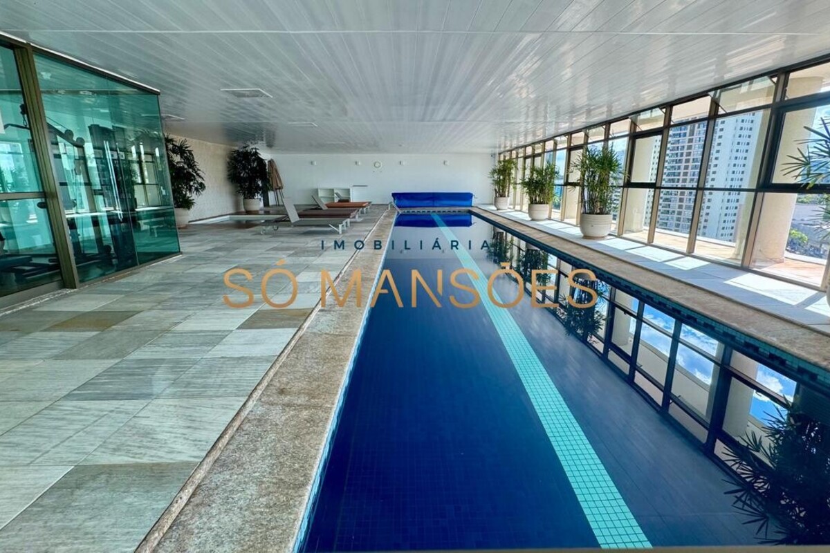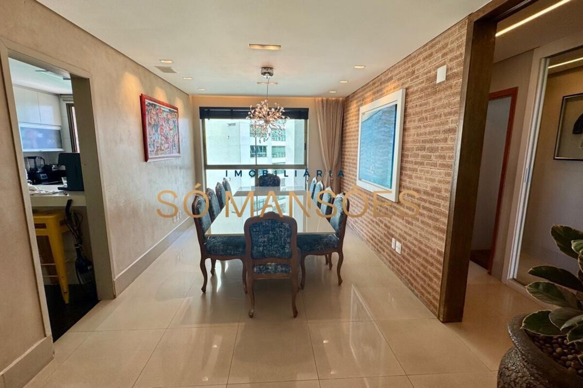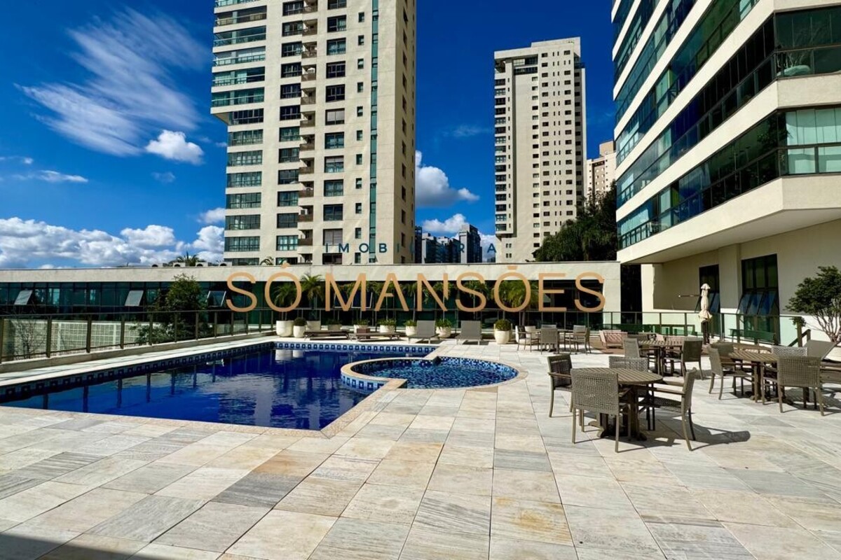 Os acabamentos reforçam o alto padrão do imóvel, com pisos em porcelanato, mármore e granito, madeira maciça, marcenaria planejada e ar-condicionado nas suítes. O apartamento conta ainda com 4 vagas de garagem livres e paralelas.