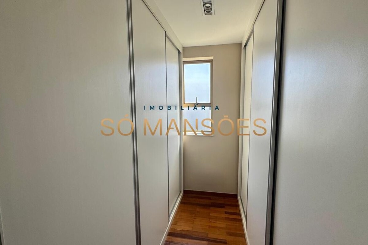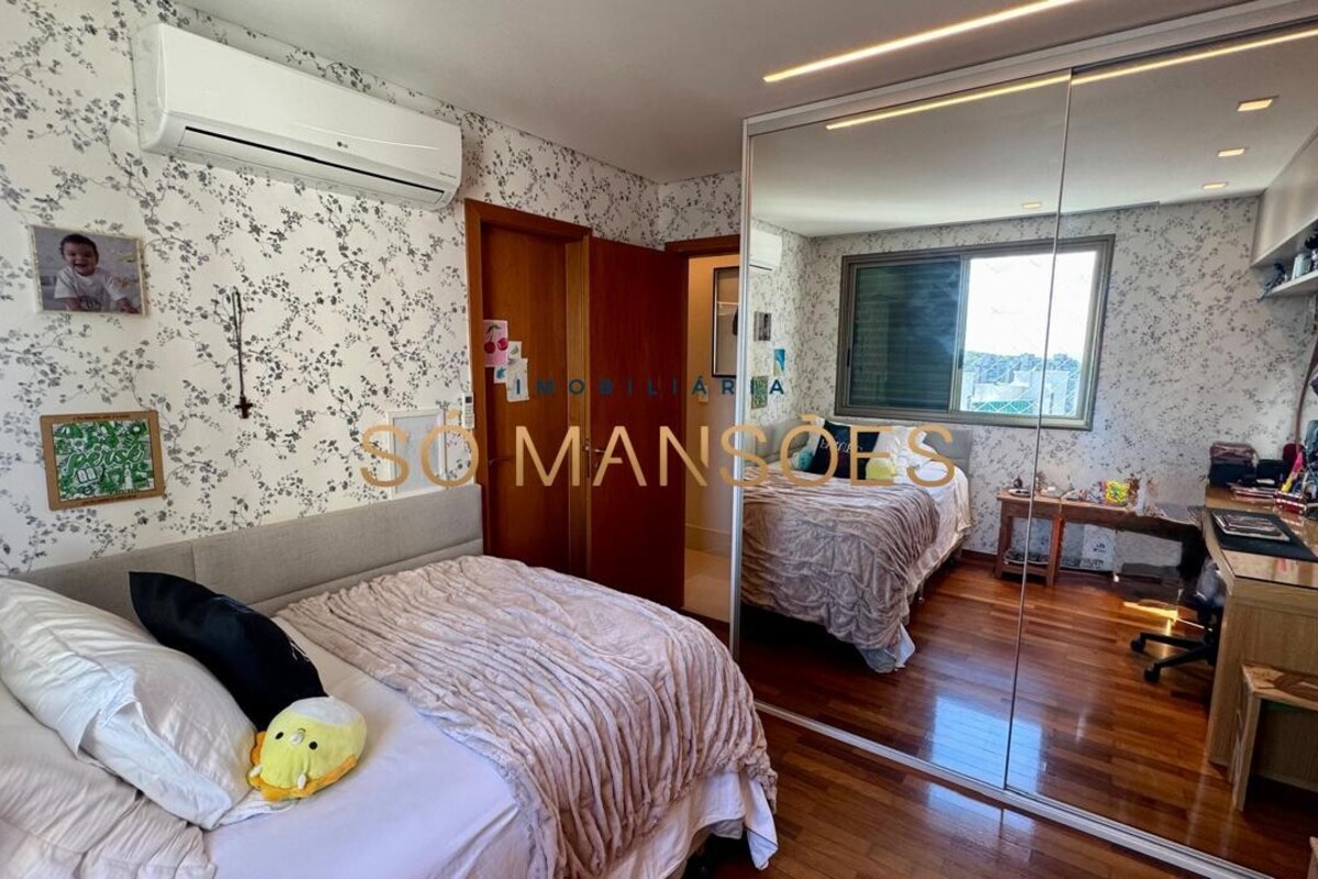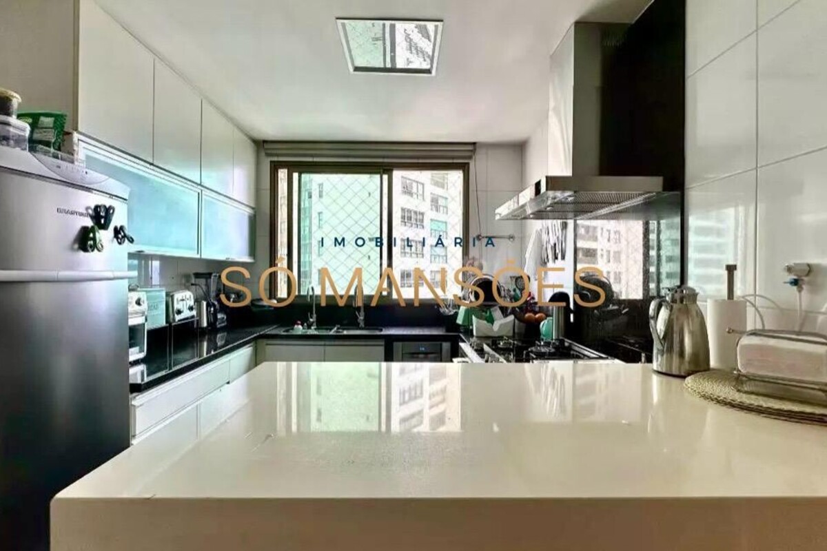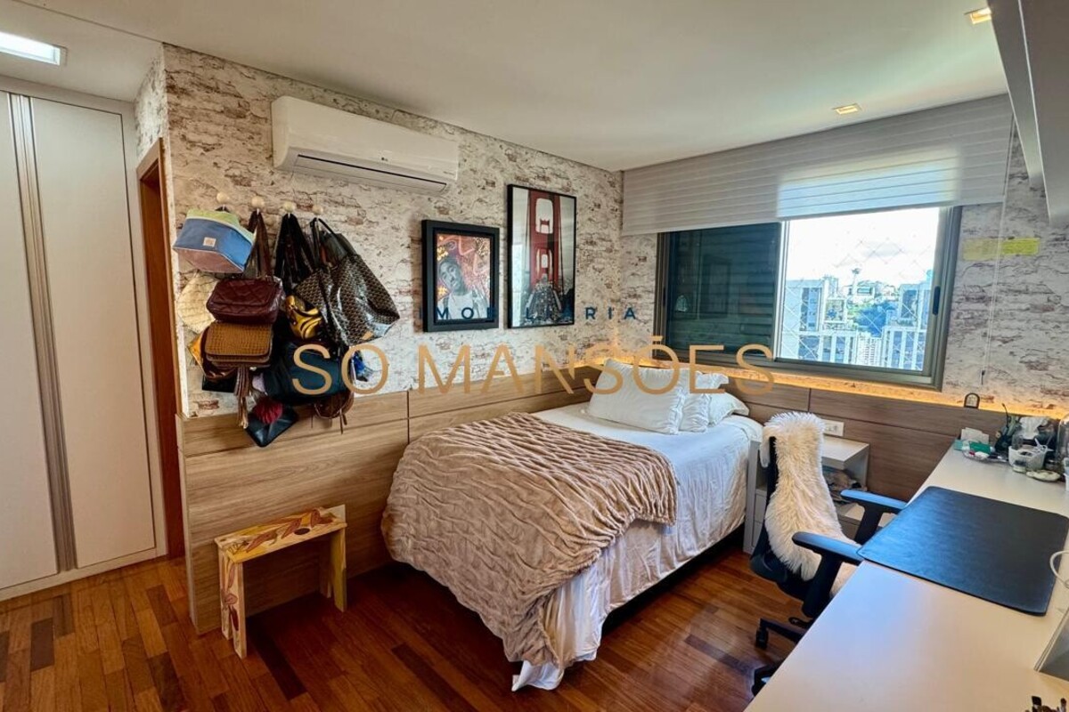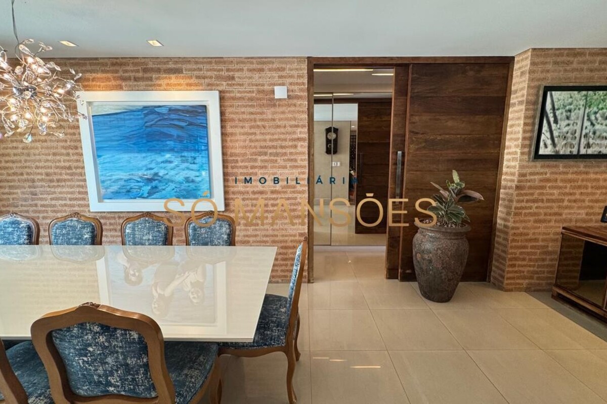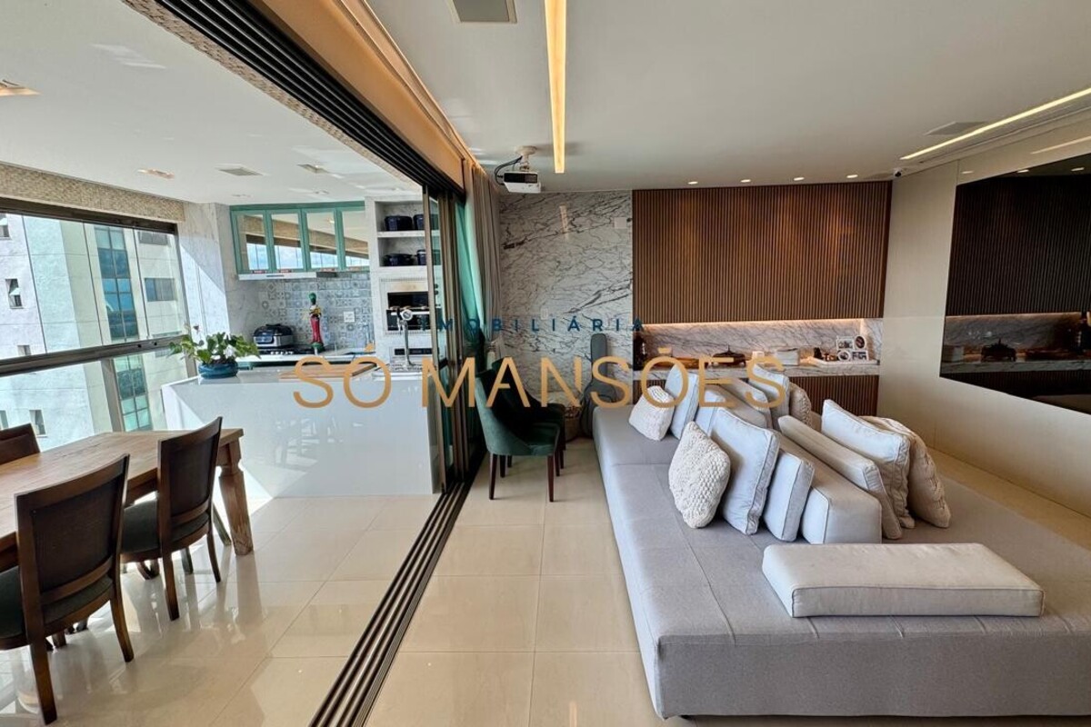 Os acabamentos reforçam o alto padrão do imóvel, com pisos em porcelanato, mármore e granito, madeira maciça, marcenaria planejada e ar-condicionado nas suítes. O apartamento conta ainda com 4 vagas de garagem livres e paralelas.