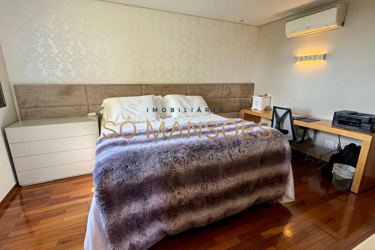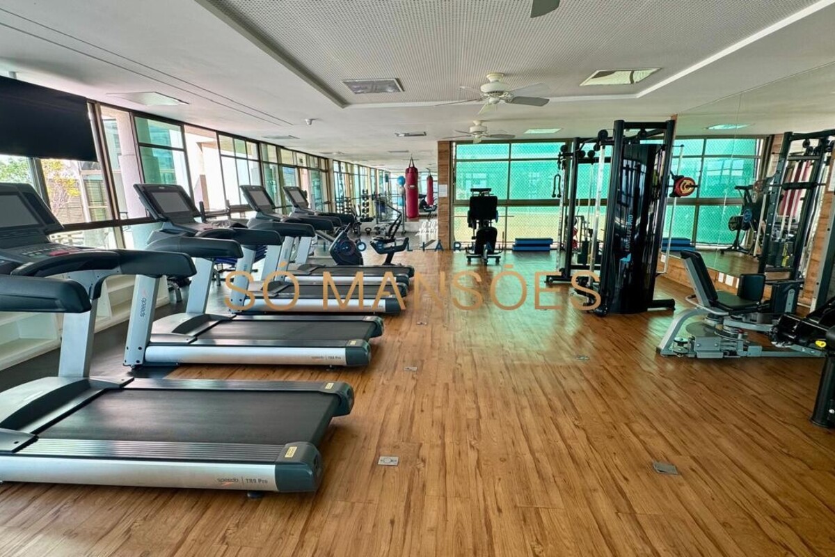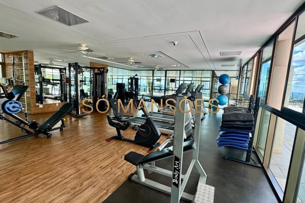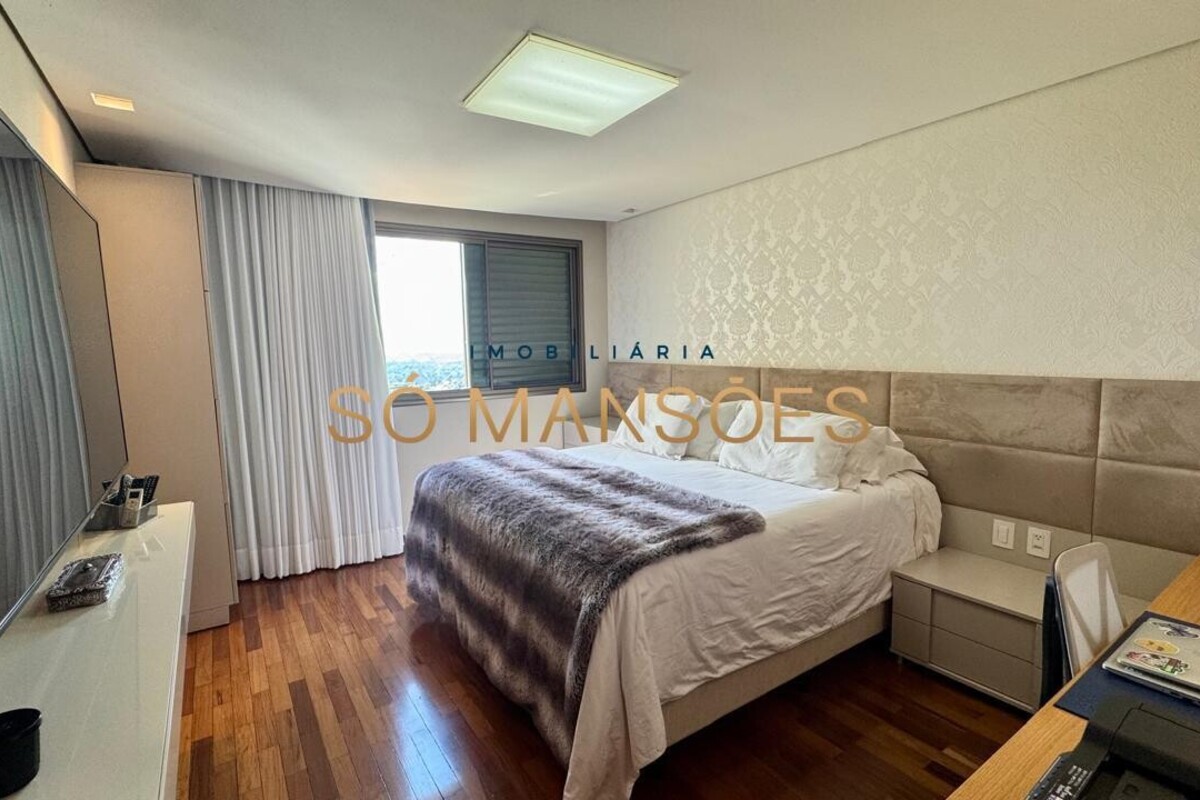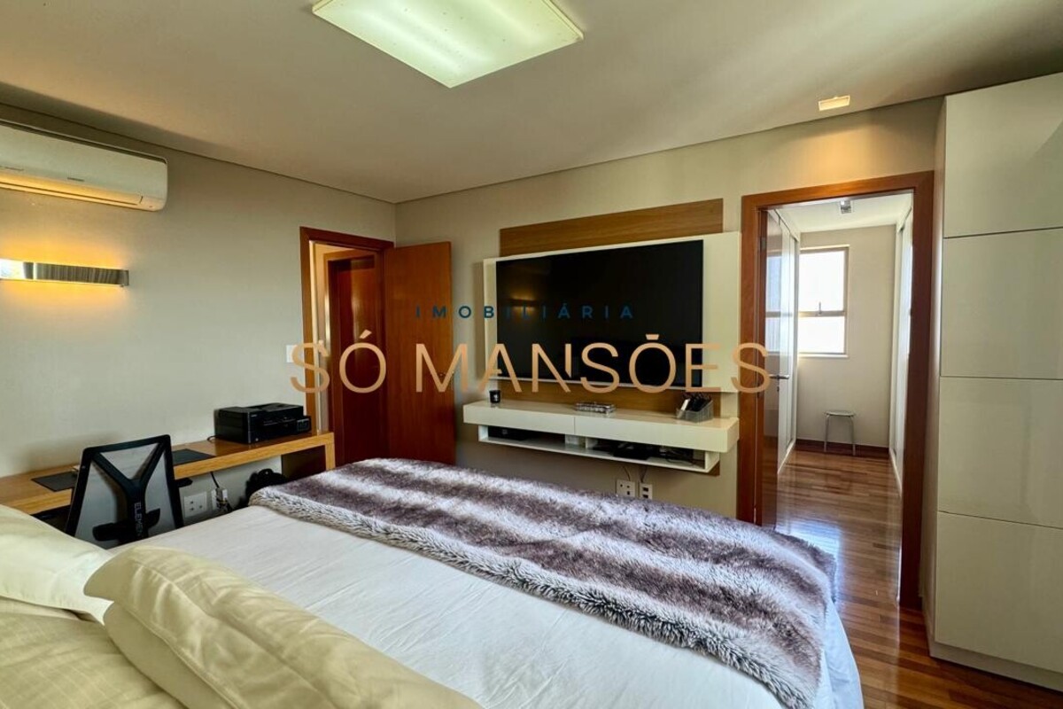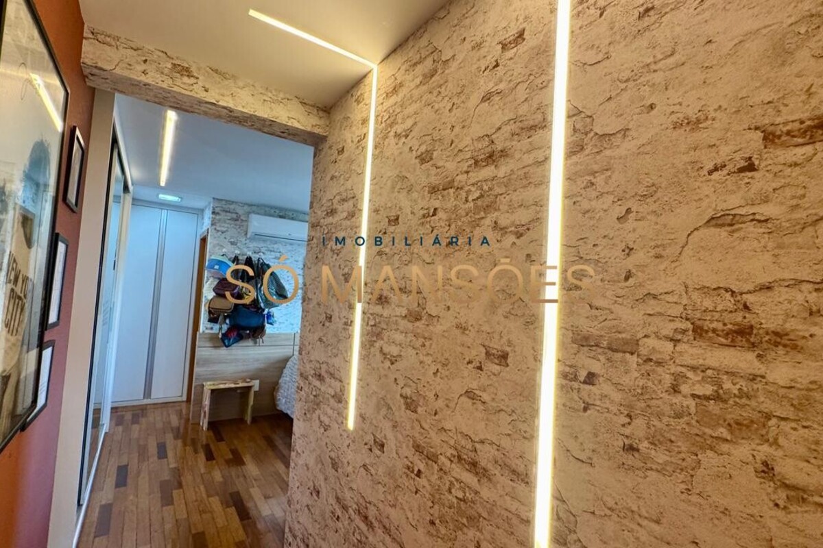 Os acabamentos reforçam o alto padrão do imóvel, com pisos em porcelanato, mármore e granito, madeira maciça, marcenaria planejada e ar-condicionado nas suítes. O apartamento conta ainda com 4 vagas de garagem livres e paralelas.