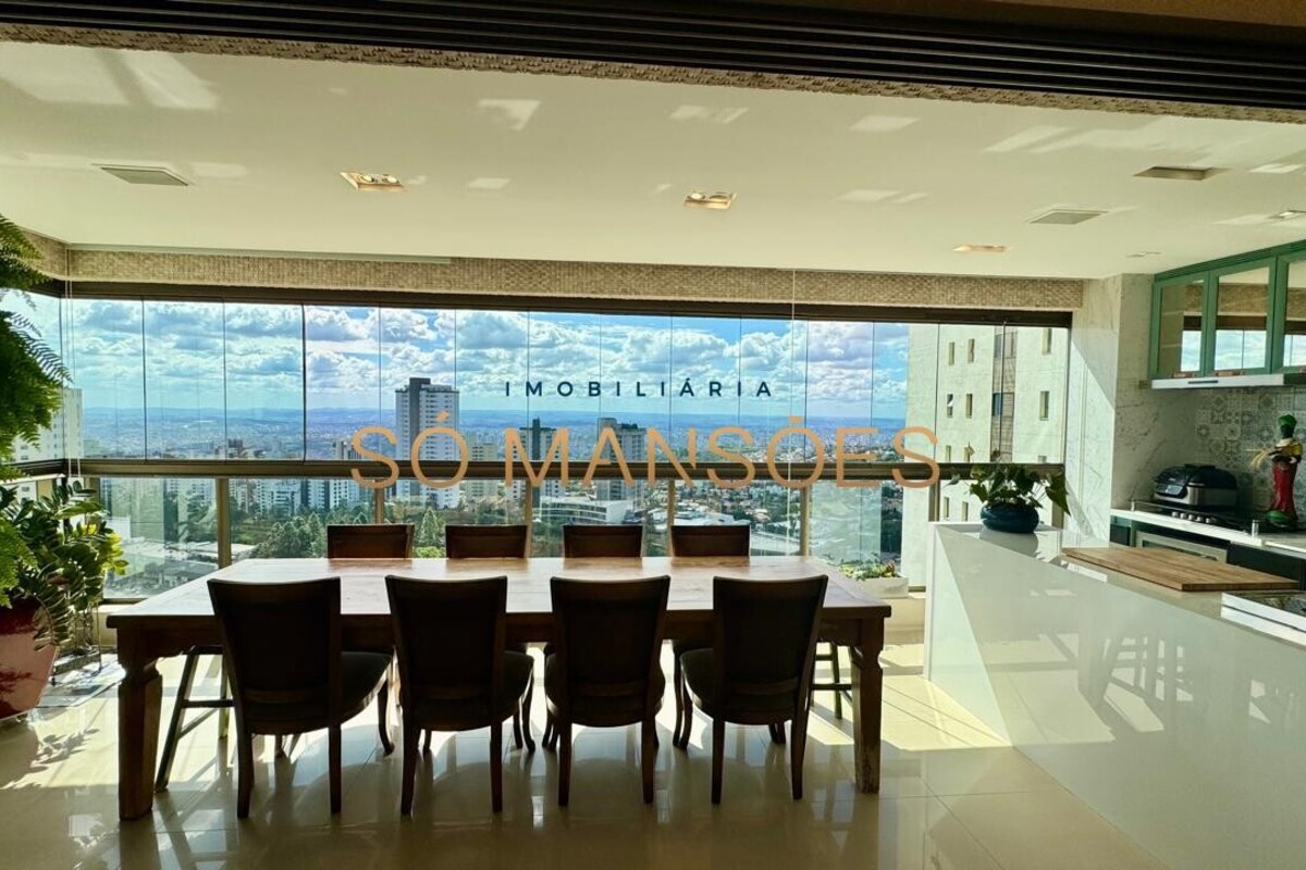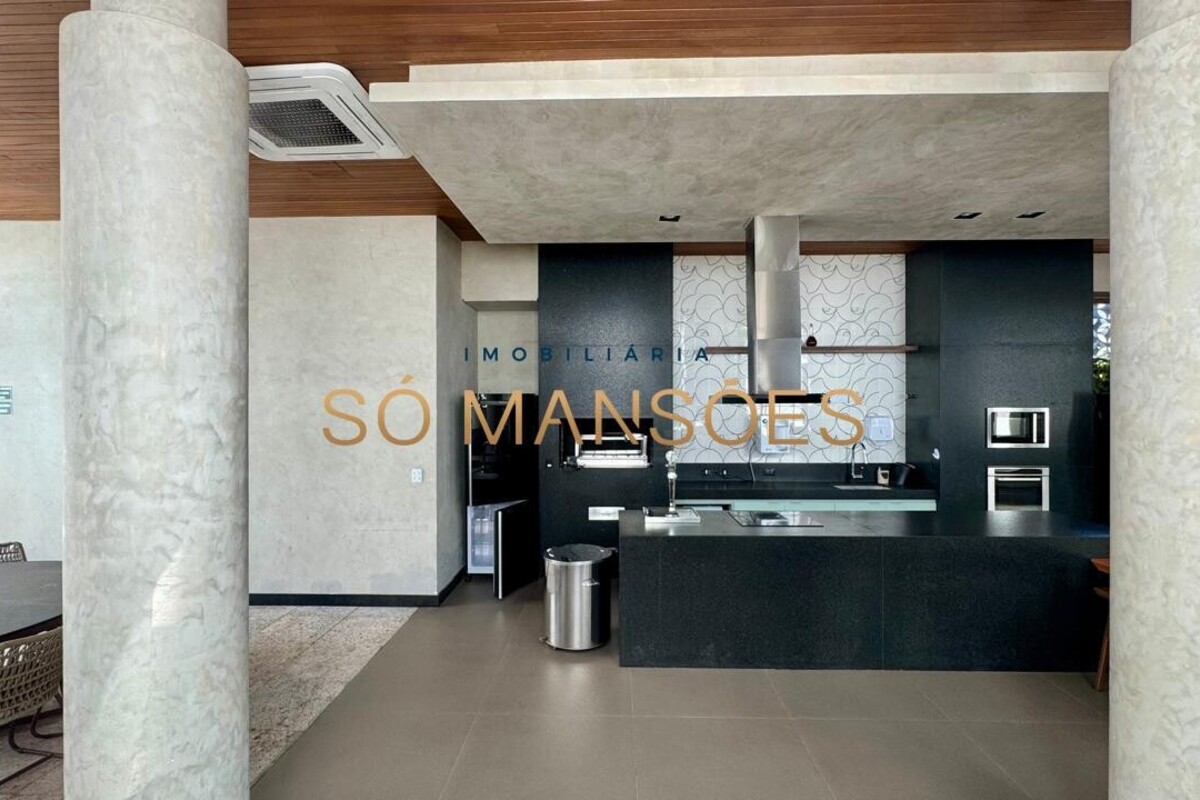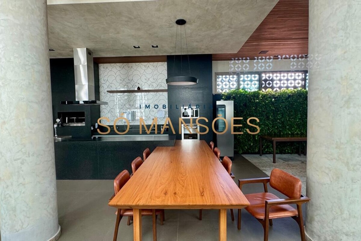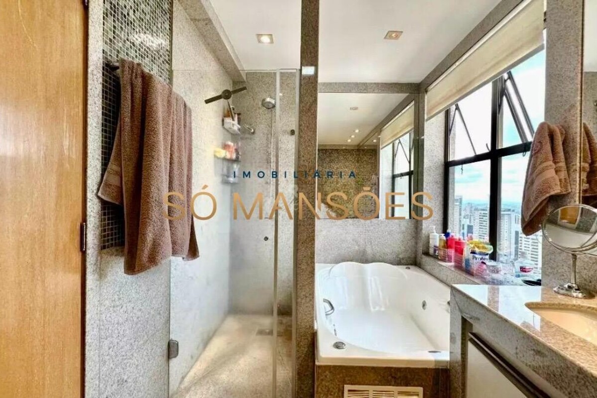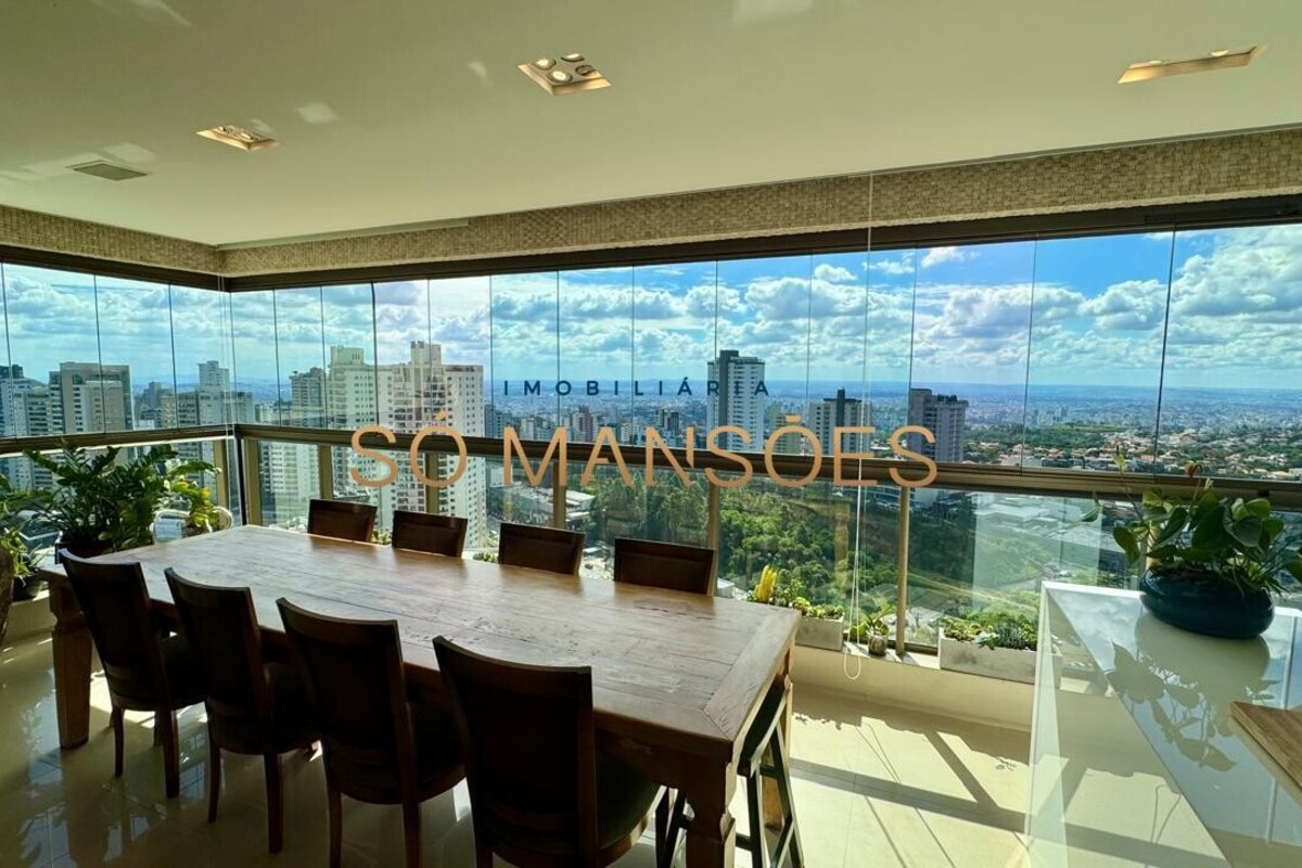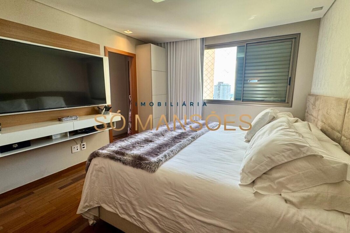 Os acabamentos reforçam o alto padrão do imóvel, com pisos em porcelanato, mármore e granito, madeira maciça, marcenaria planejada e ar-condicionado nas suítes. O apartamento conta ainda com 4 vagas de garagem livres e paralelas.