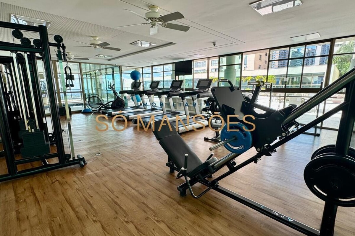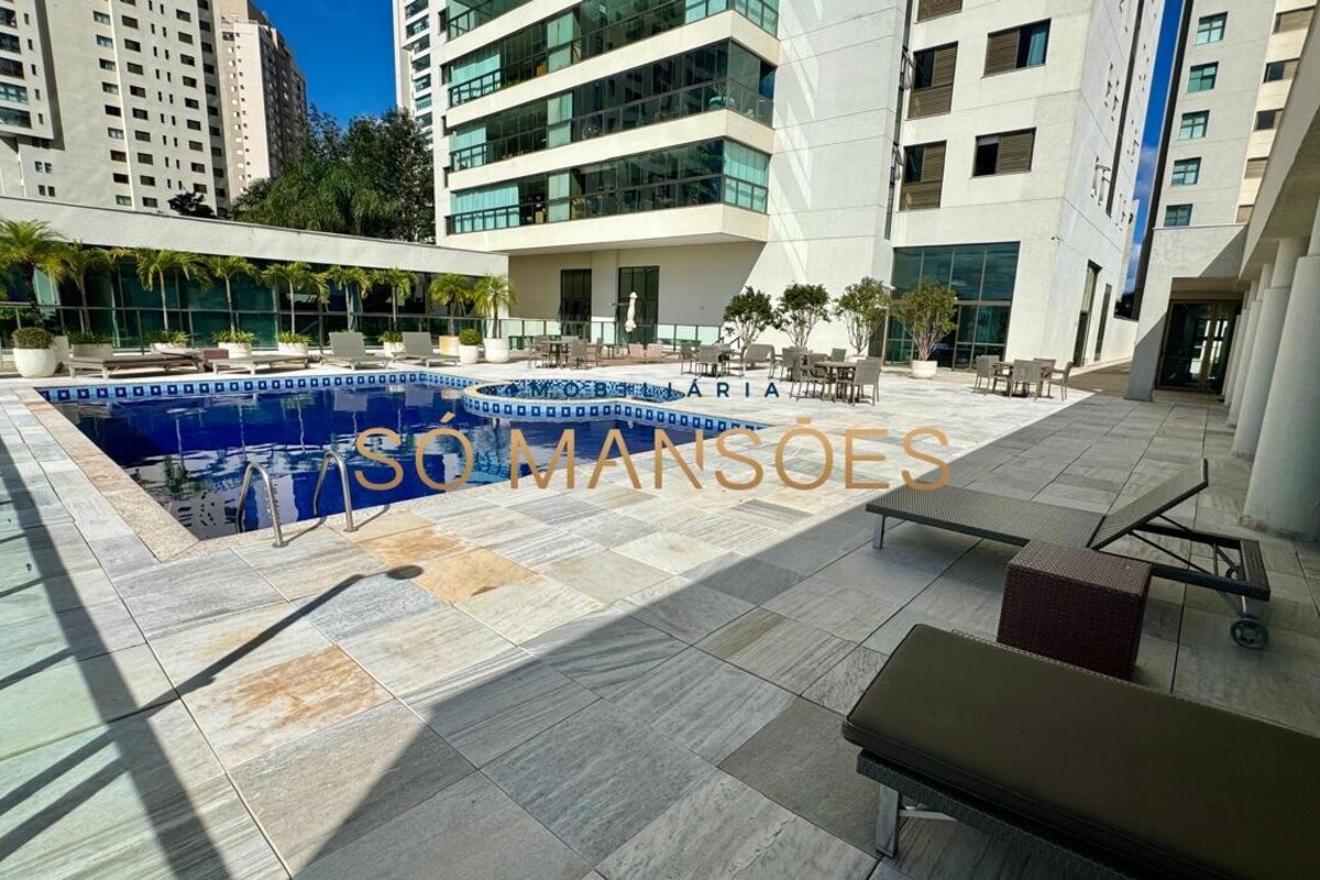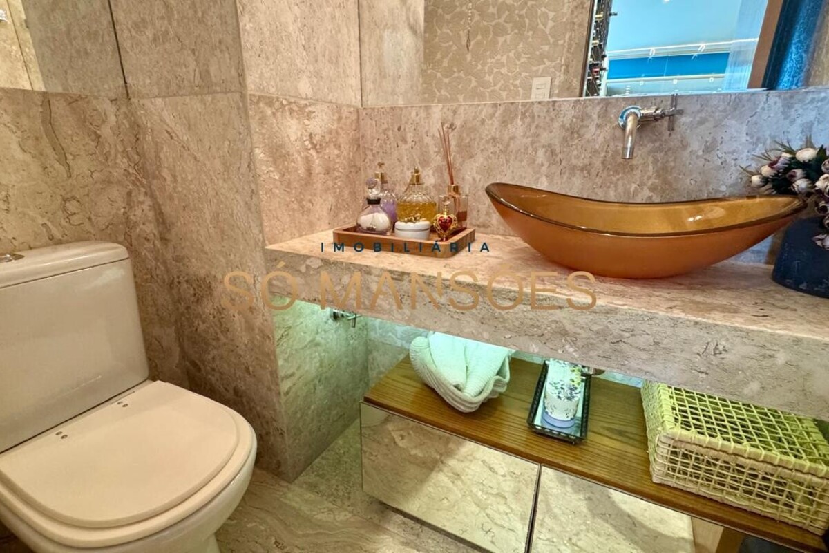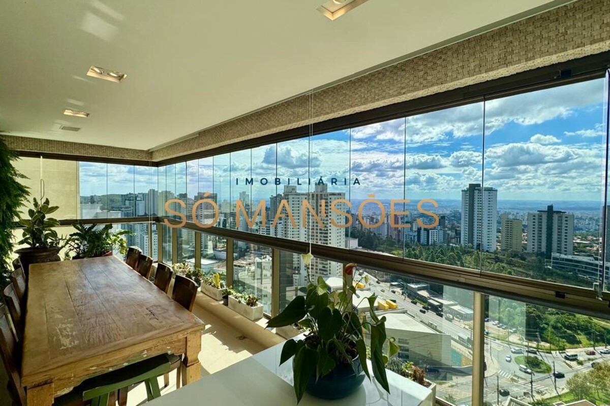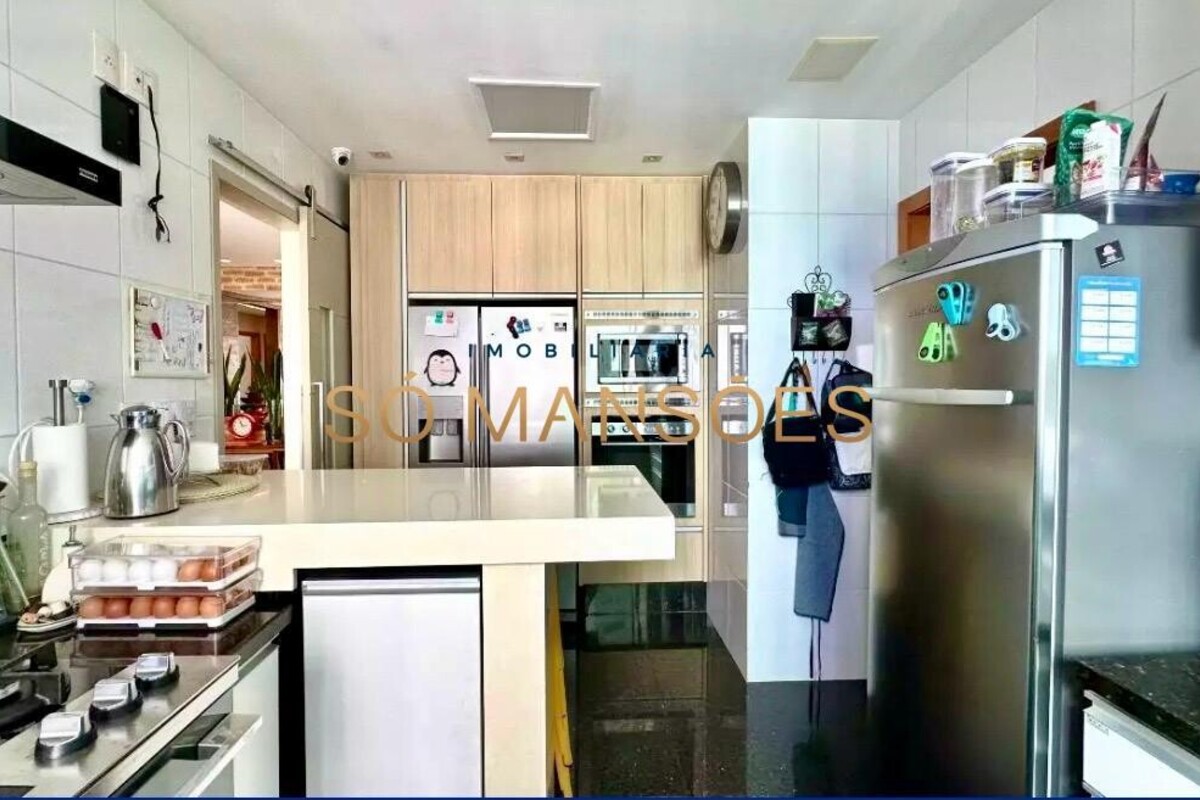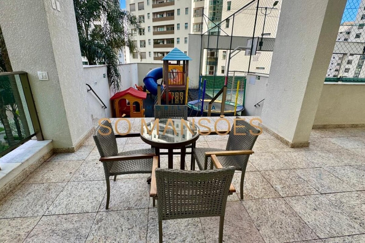 Os acabamentos reforçam o alto padrão do imóvel, com pisos em porcelanato, mármore e granito, madeira maciça, marcenaria planejada e ar-condicionado nas suítes. O apartamento conta ainda com 4 vagas de garagem livres e paralelas.