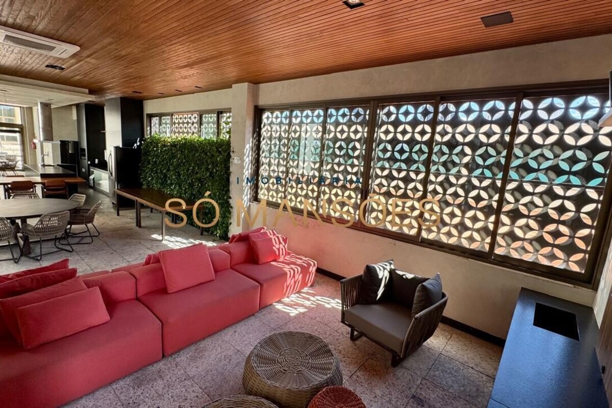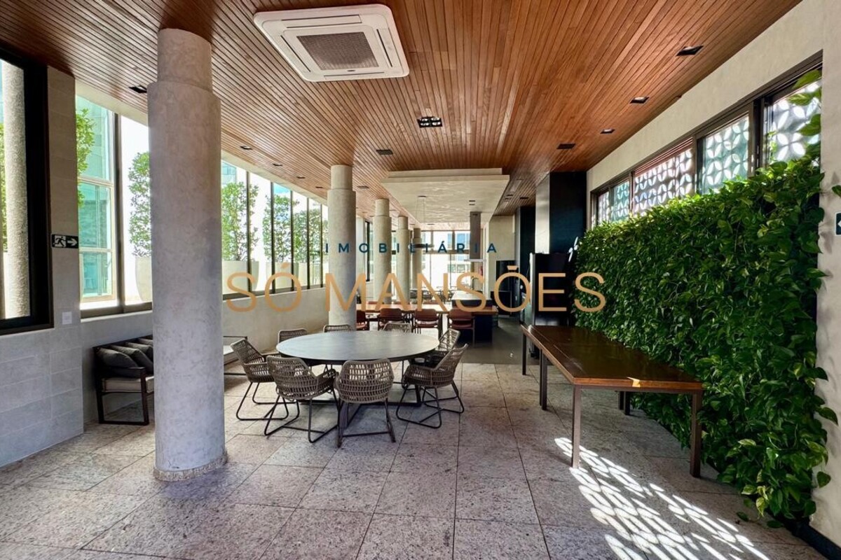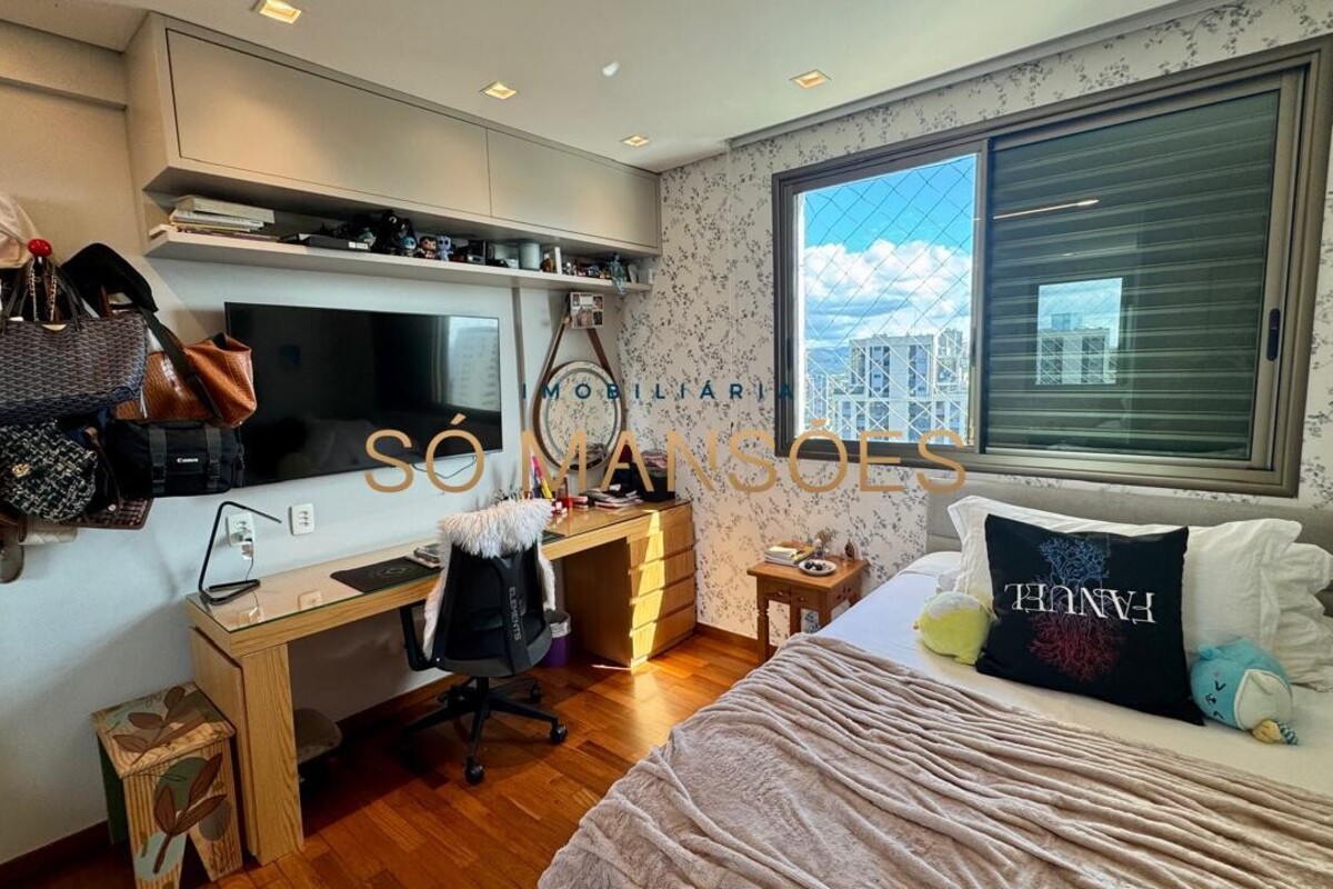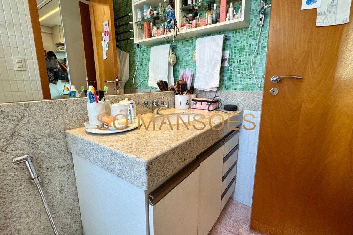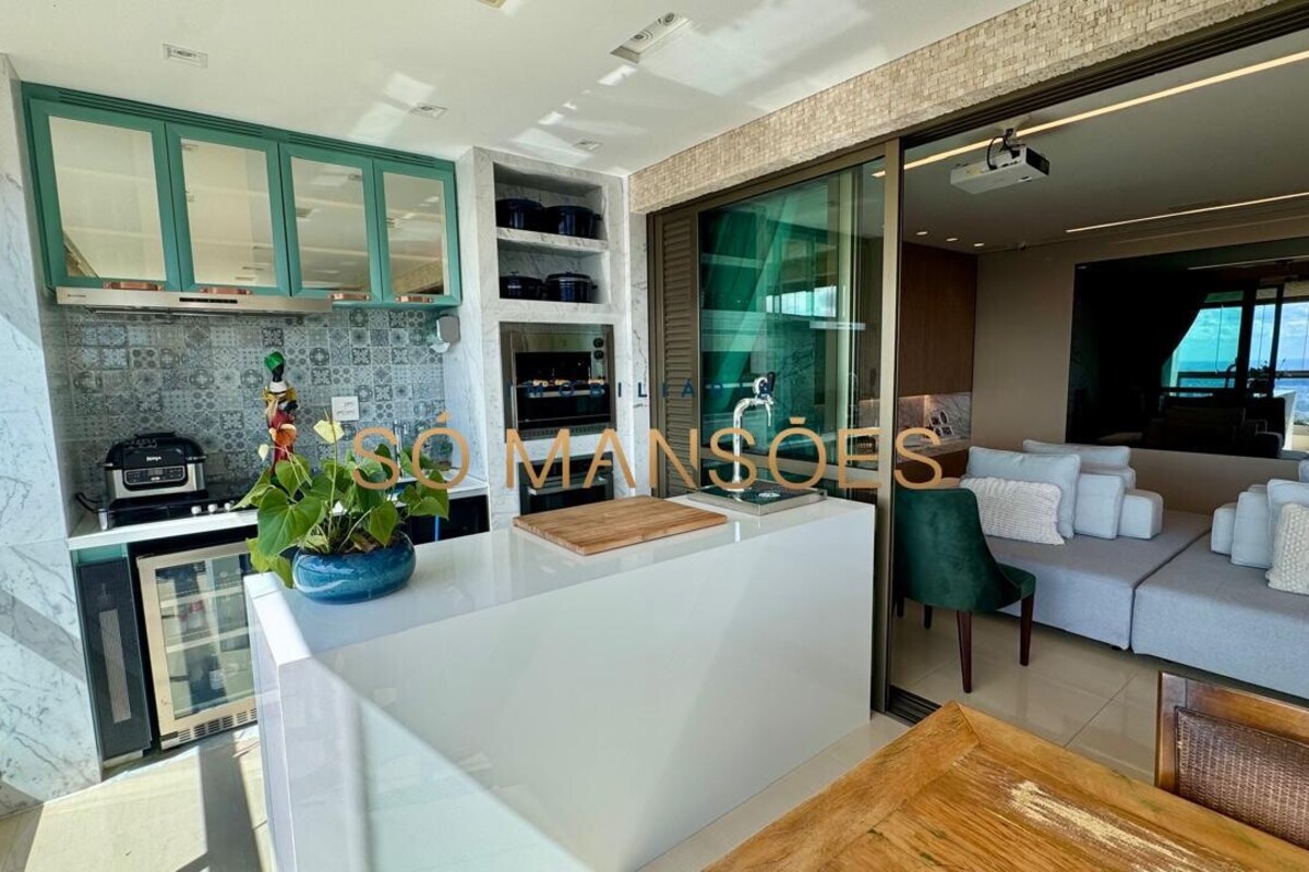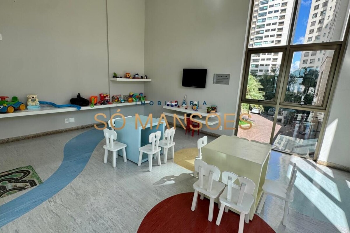 Os acabamentos reforçam o alto padrão do imóvel, com pisos em porcelanato, mármore e granito, madeira maciça, marcenaria planejada e ar-condicionado nas suítes. O apartamento conta ainda com 4 vagas de garagem livres e paralelas.