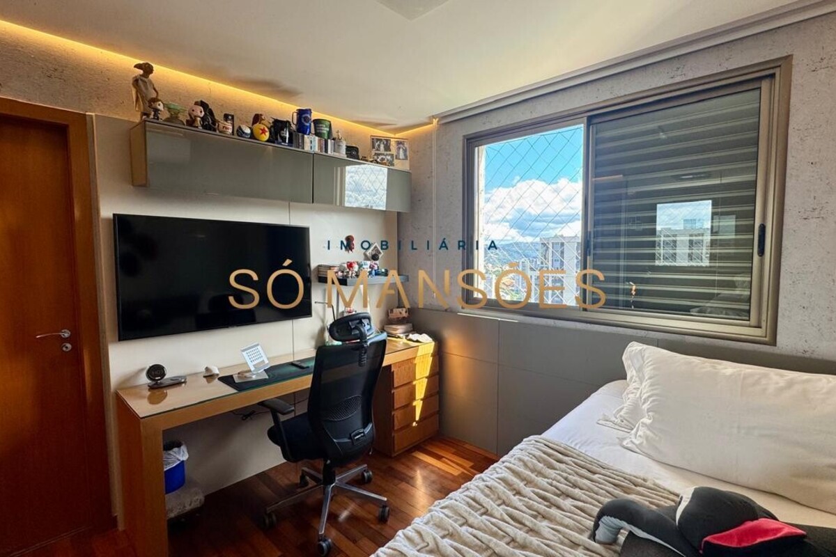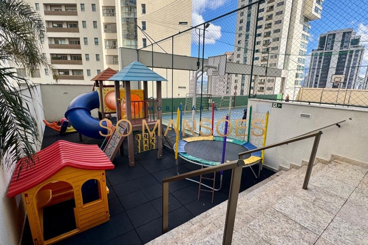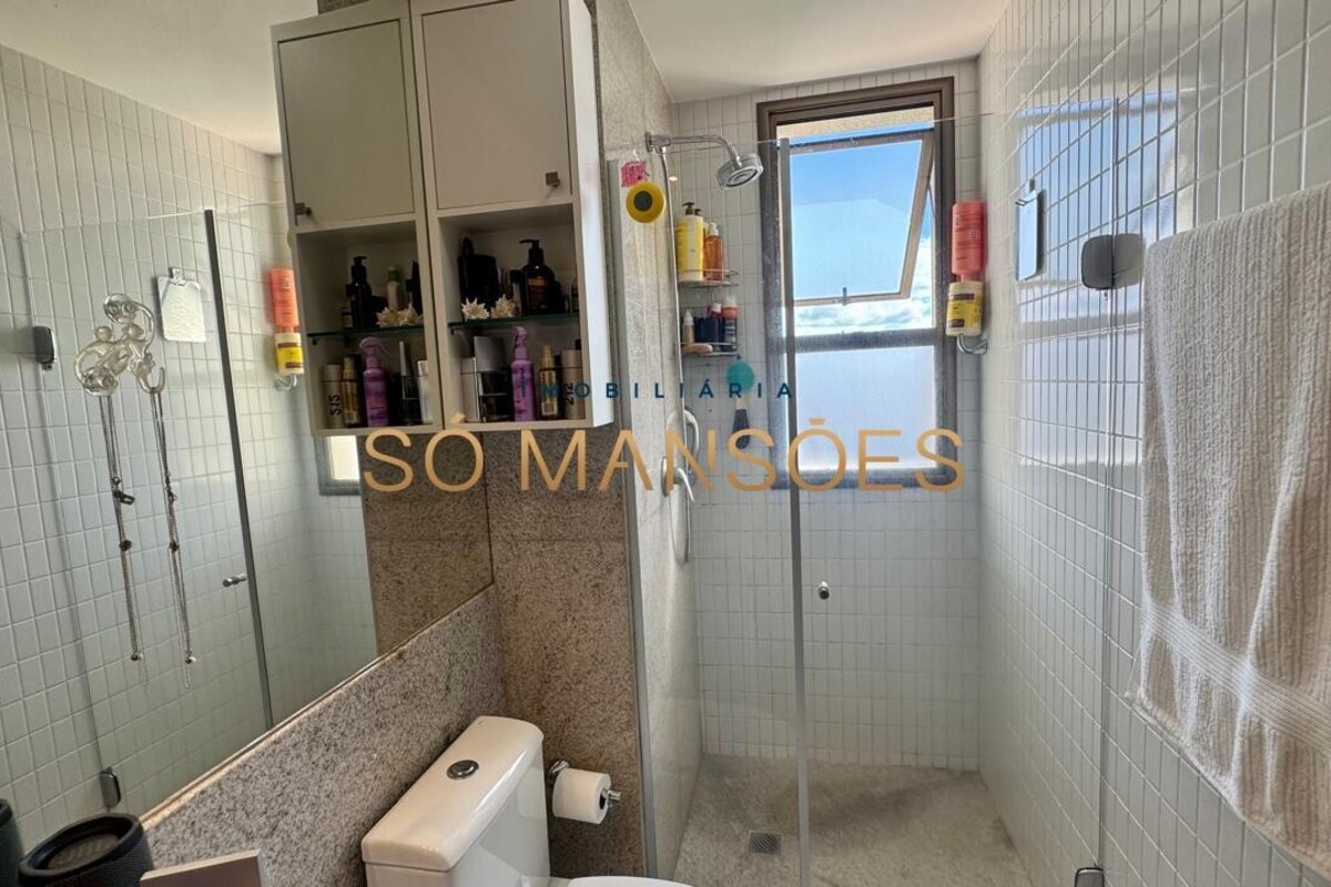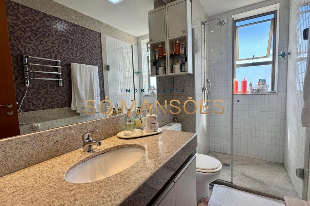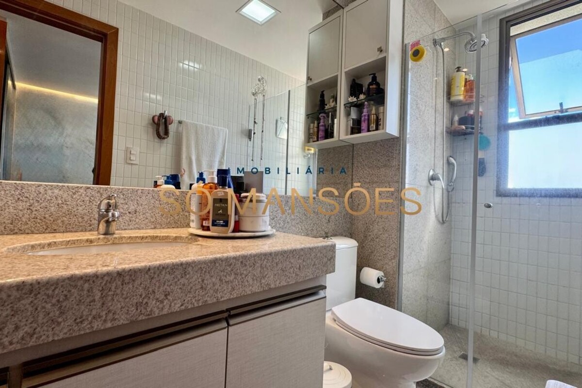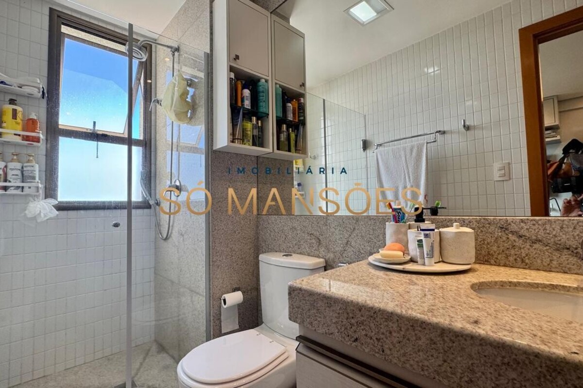 Os acabamentos reforçam o alto padrão do imóvel, com pisos em porcelanato, mármore e granito, madeira maciça, marcenaria planejada e ar-condicionado nas suítes. O apartamento conta ainda com 4 vagas de garagem livres e paralelas.