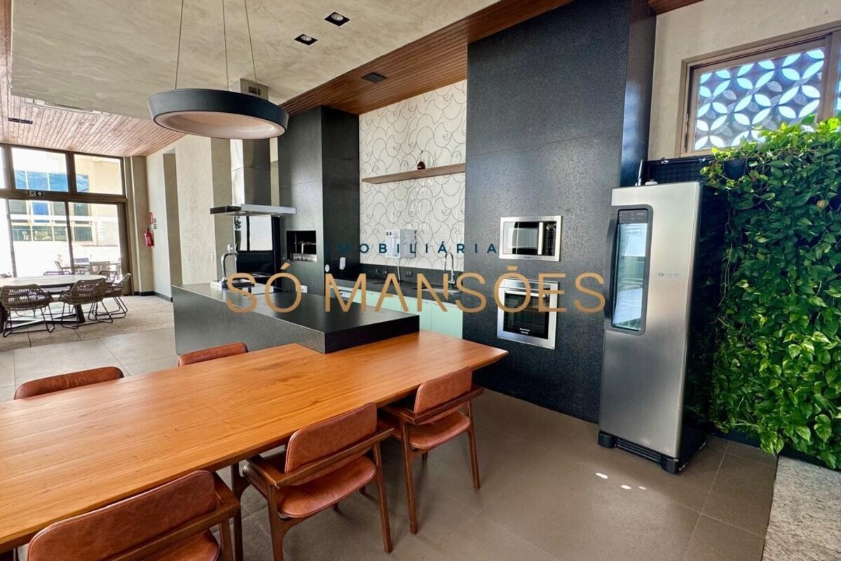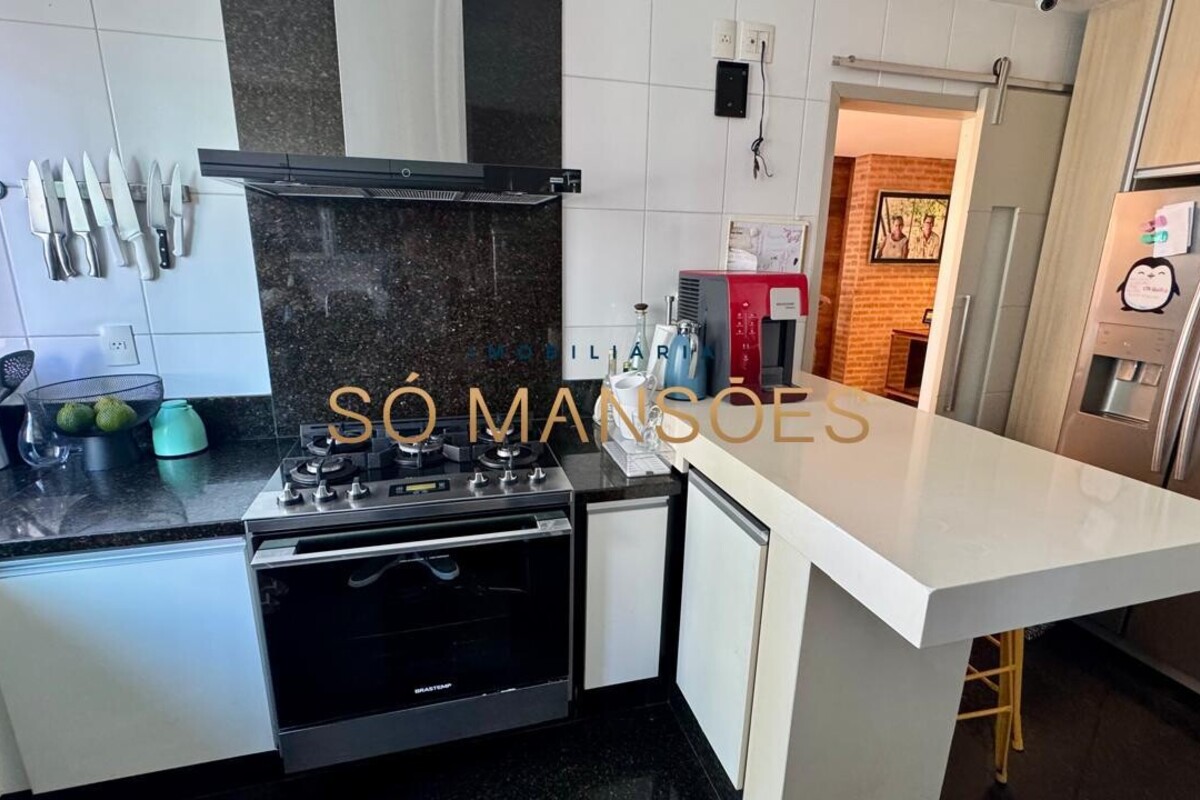A cozinha é funcional e bem planejada, com marcenaria de alto padrão, bancadas em granito e Silestone, além de despensa e área de serviço independente com DCE.