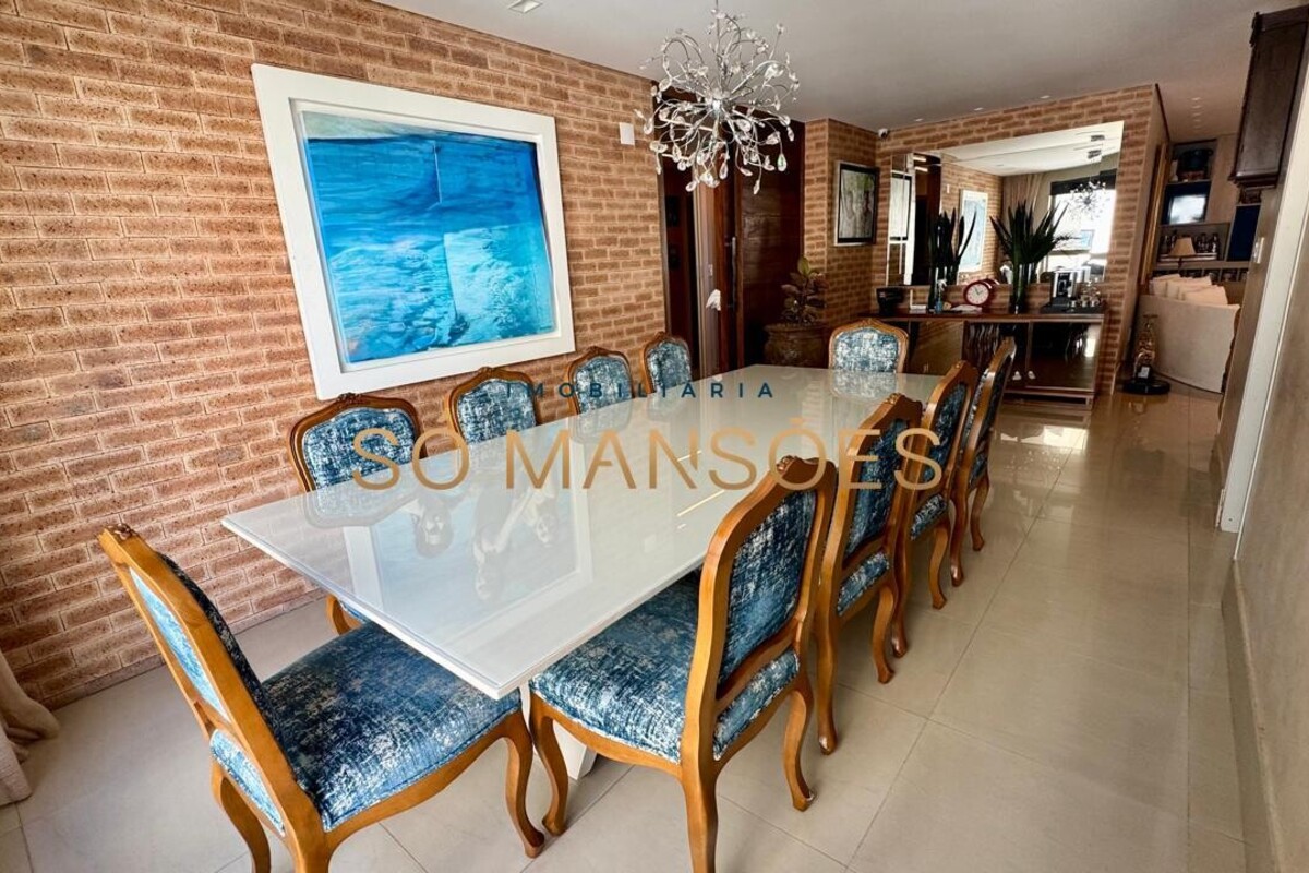 Com 244 m², o imóvel apresenta uma planta generosa e bem distribuída, com 4 suítes climatizadas, sendo a suíte master equipada com closet e hidromassagem. Os ambientes sociais são amplos e integrados, com três salas elegantes, incluindo um home cinema com painel Cinex, além de lavabo com acabamento em mármore.