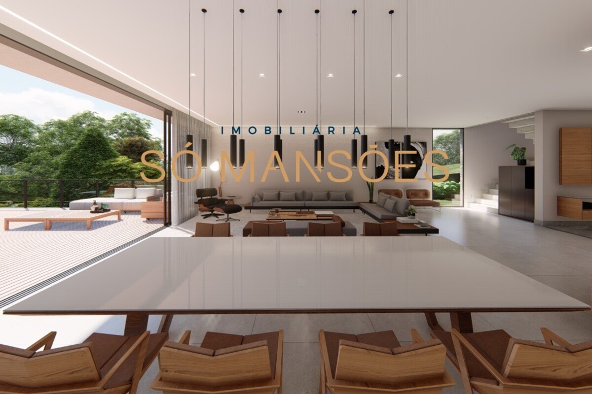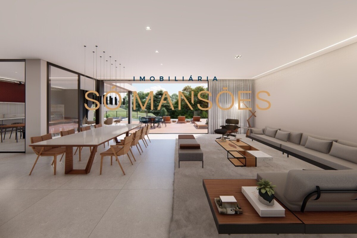 Sala ampla com pé-direito alto integrada à cozinha e ao espaço gourmet