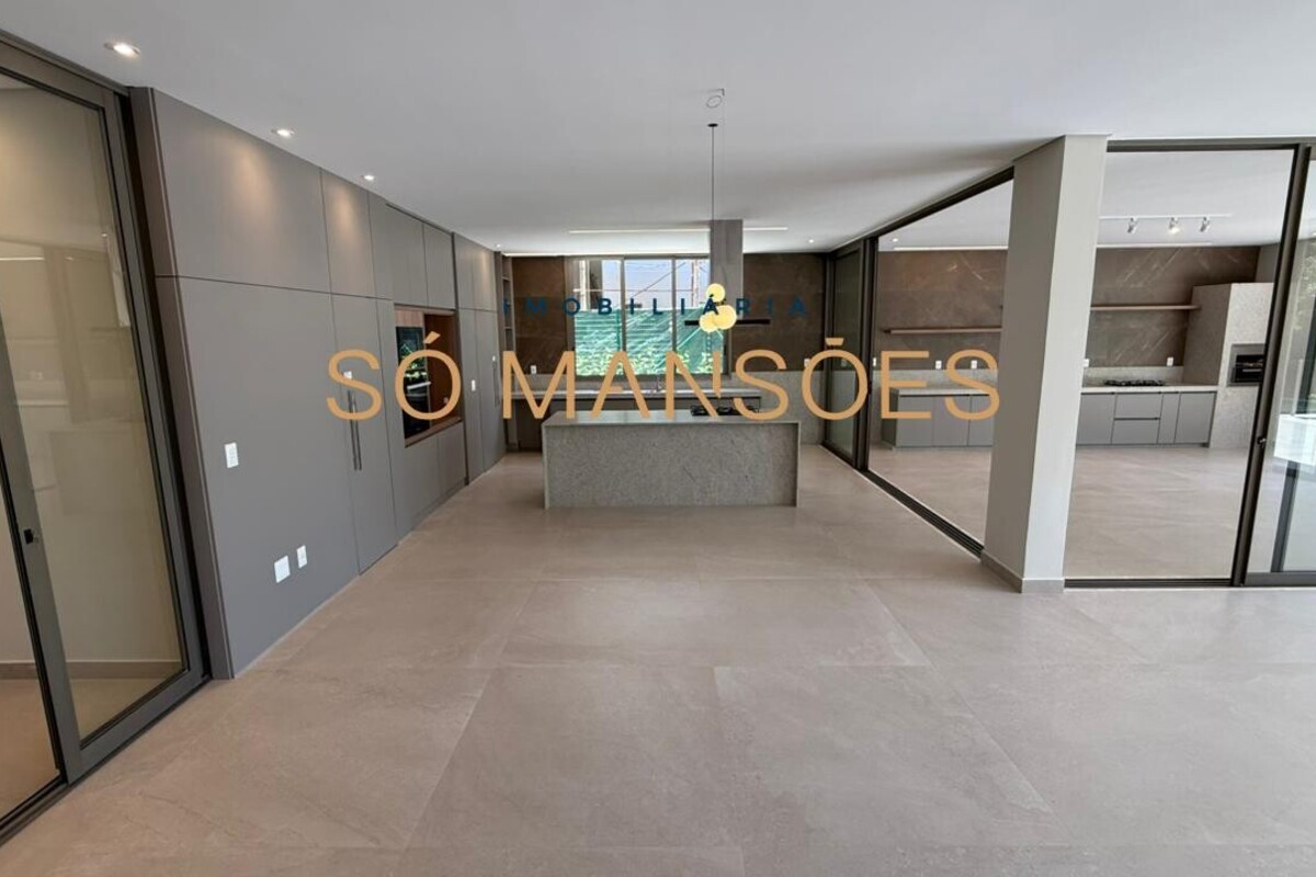 Sala ampla com pé-direito alto integrada à cozinha e ao espaço gourmet