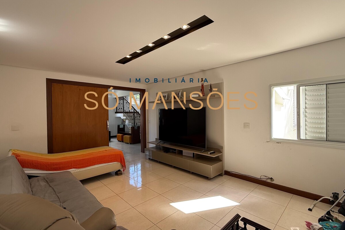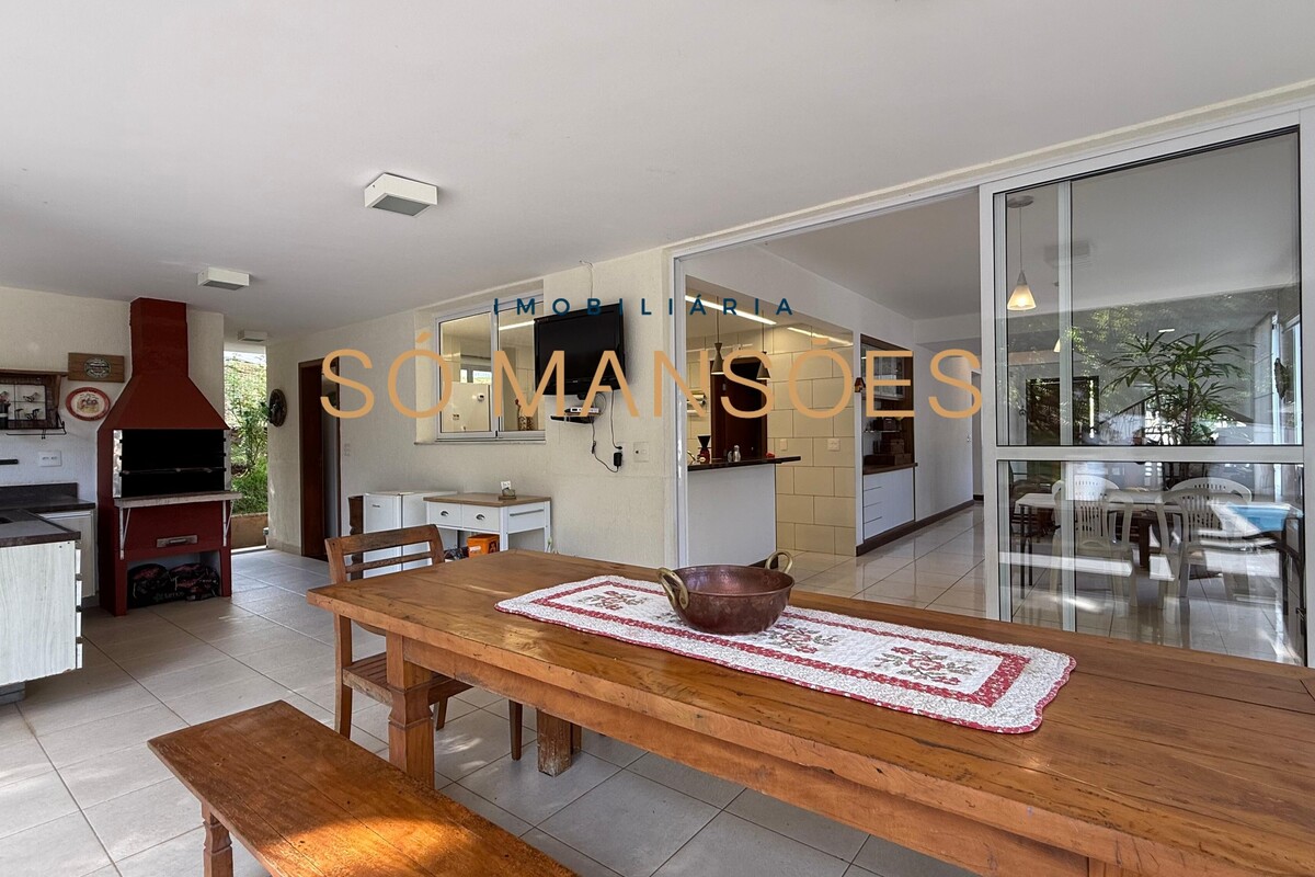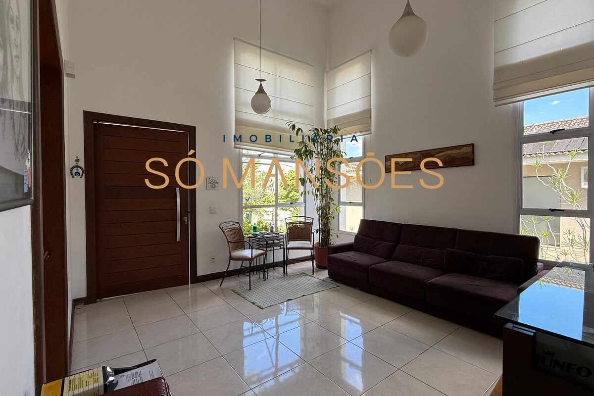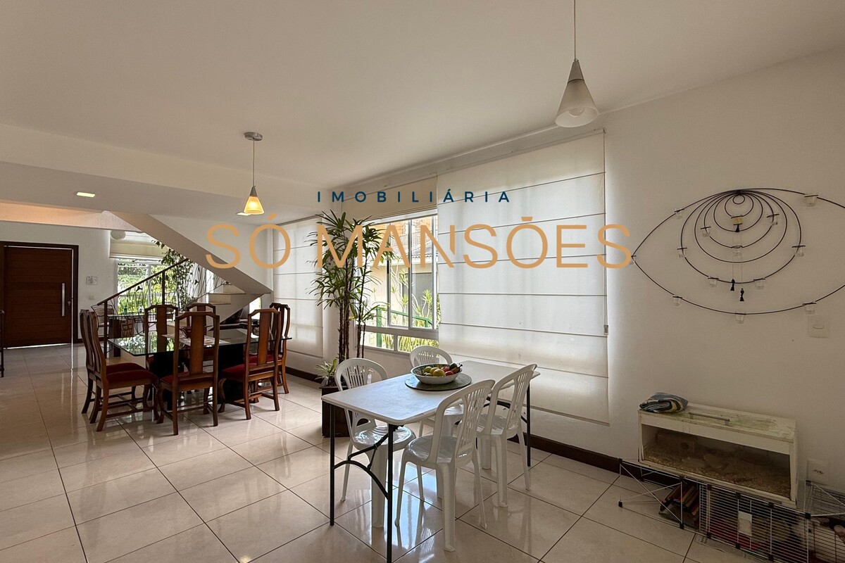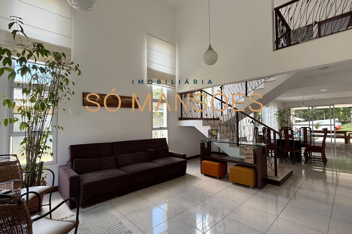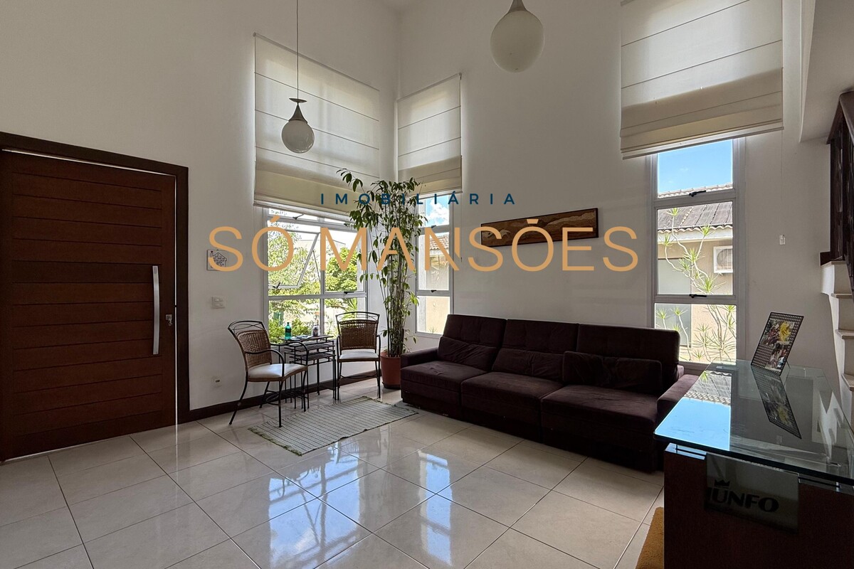A área social conta com sala ampla para três ambientes e pé-direito alto, proporcionando sensação de amplitude e elegância. A casa possui também sala de TV e lavabo, compondo um setor social equilibrado e acolhedor.