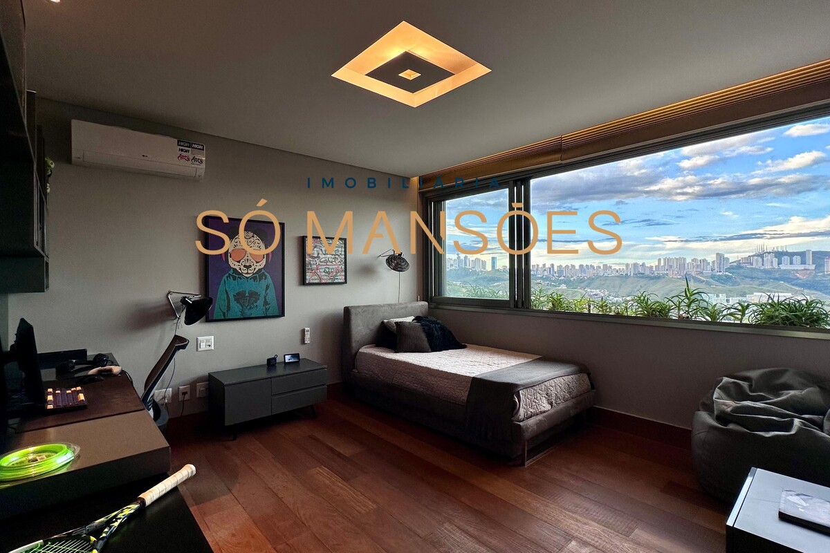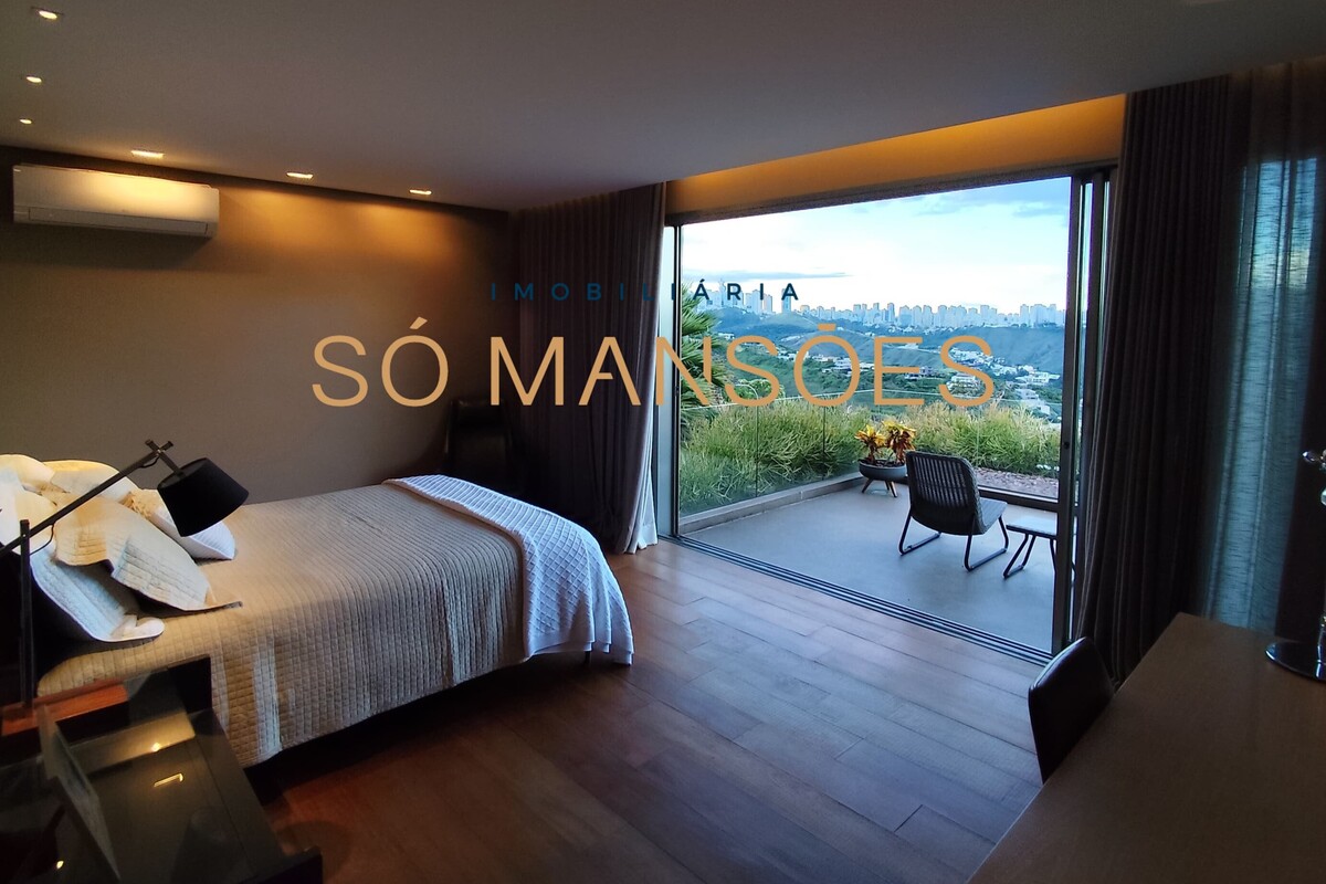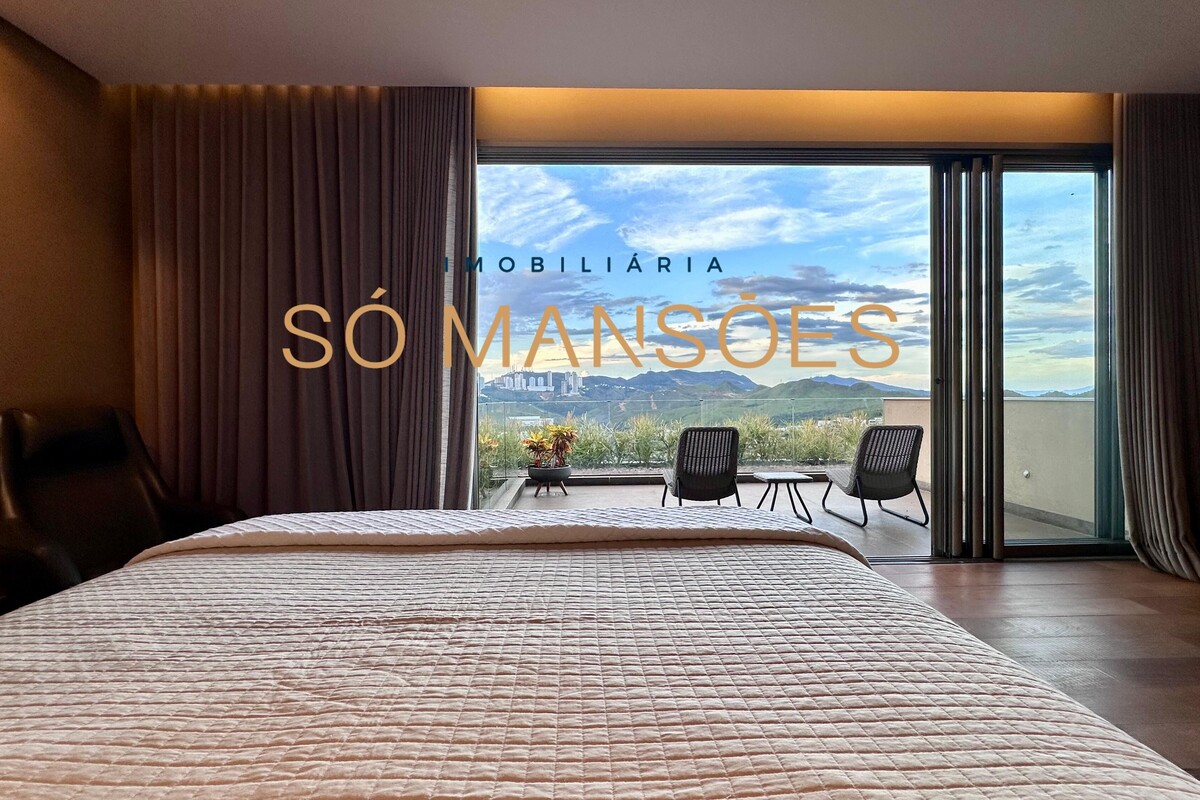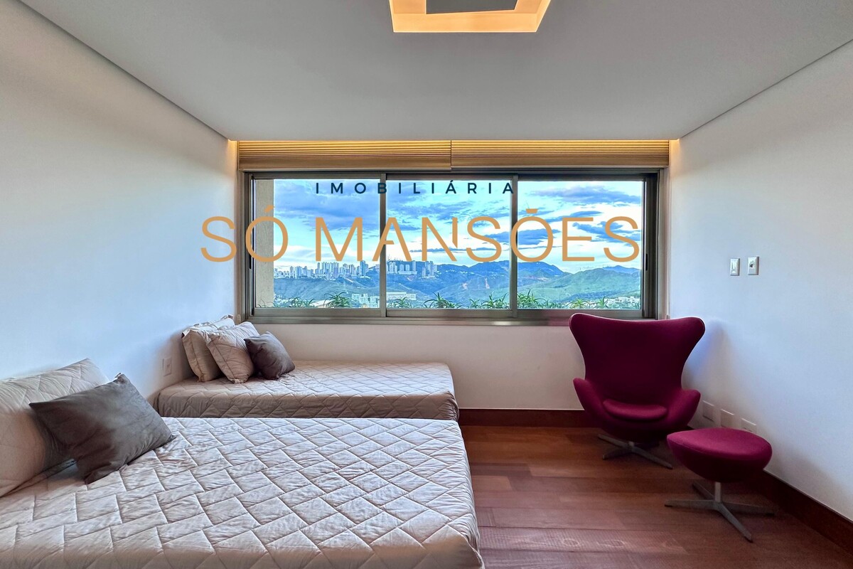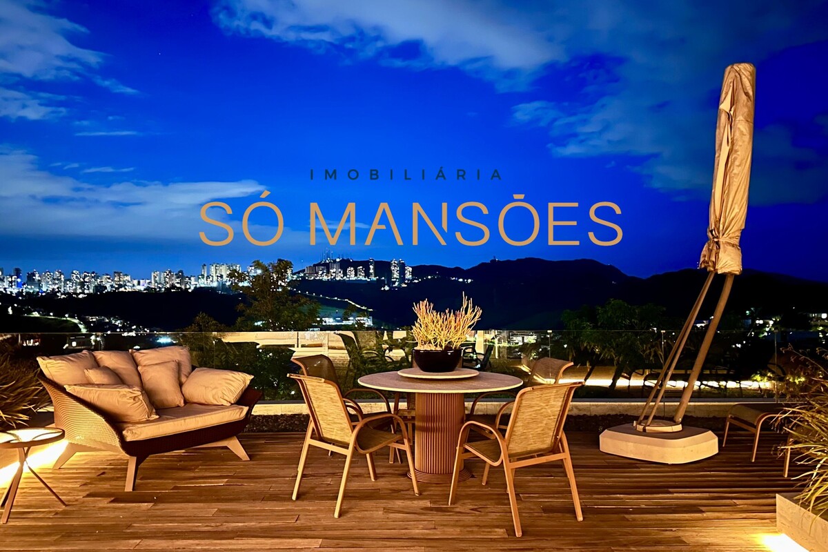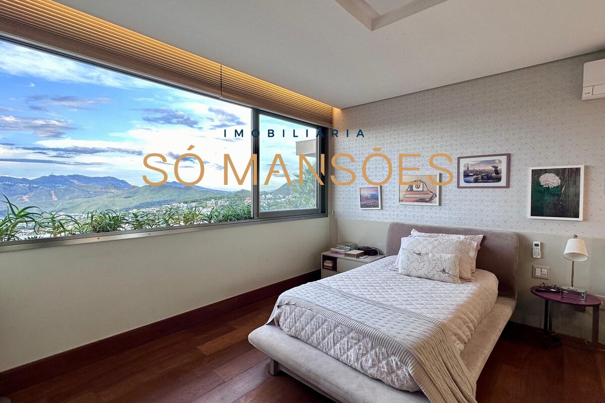 No pavimento superior estão as 4 suítes, todas com vista. A suíte master dispõe de varanda reservada, closet generoso e banho com hidromassagem. O andar conta ainda com rouparia e cozinha de apoio.