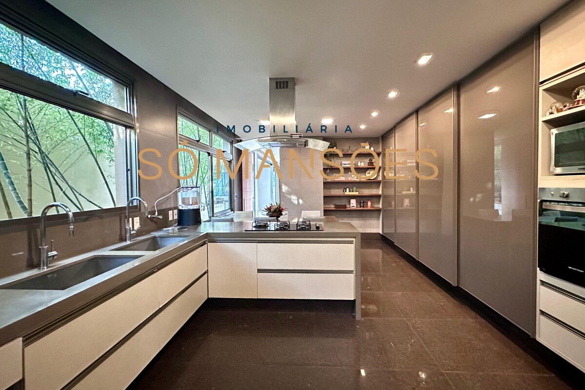 A cozinha é ampla, equipada e conta com despensa e louçaria, favorecendo organização e eficiência na rotina.