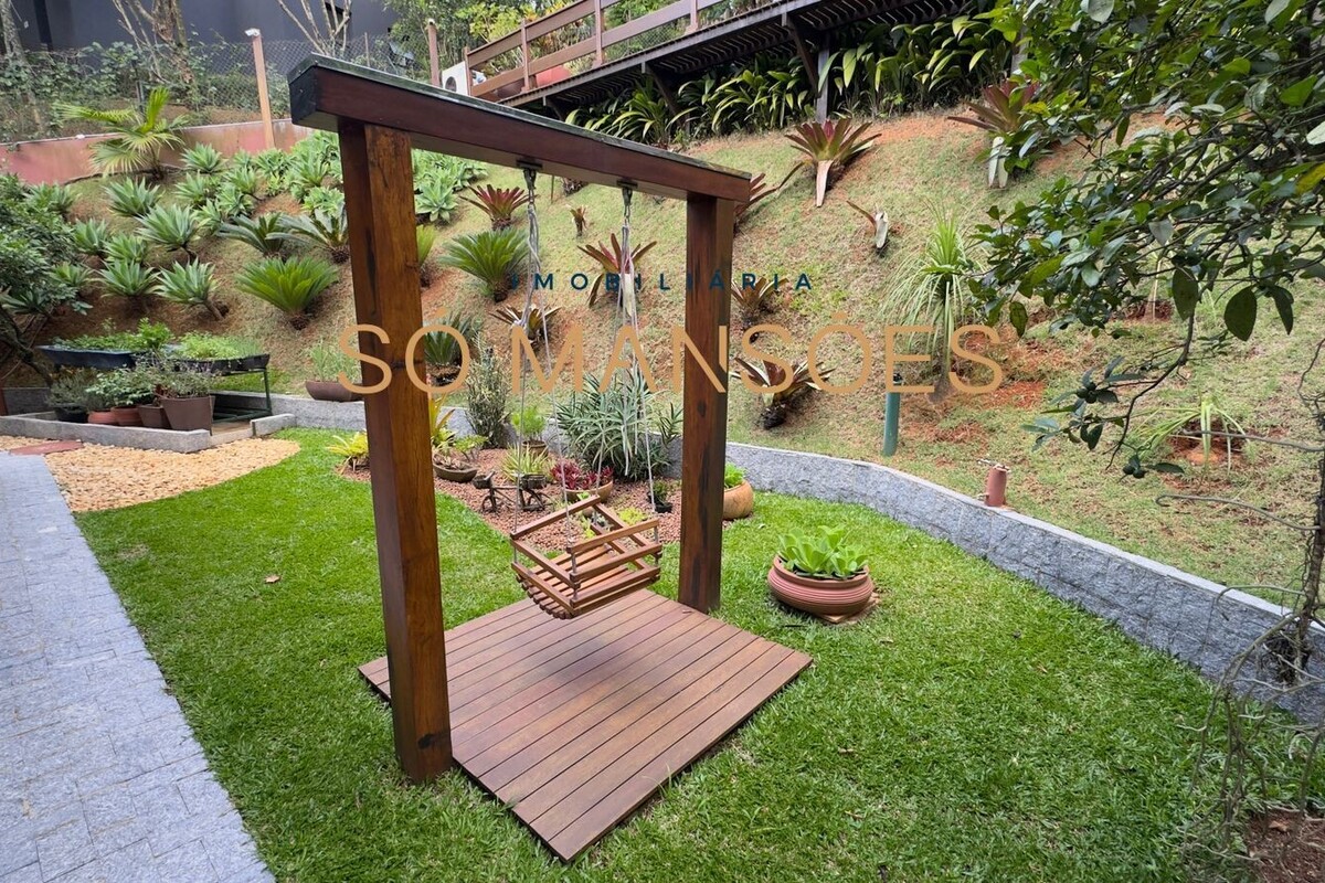 A área externa é um dos pontos mais convidativos da casa. O espaço gourmet completo, com churrasqueira, integra-se ao lazer. A piscina aquecida fica em nível elevado, com deck em madeira e vista privilegiada. O lote generoso abriga ainda área verde com casinha de brinquedos, balanço e paisagismo bem cuidado. Dois banheiros atendem à área de lazer.